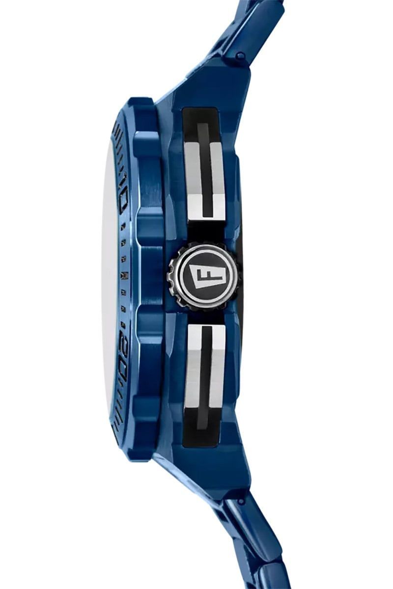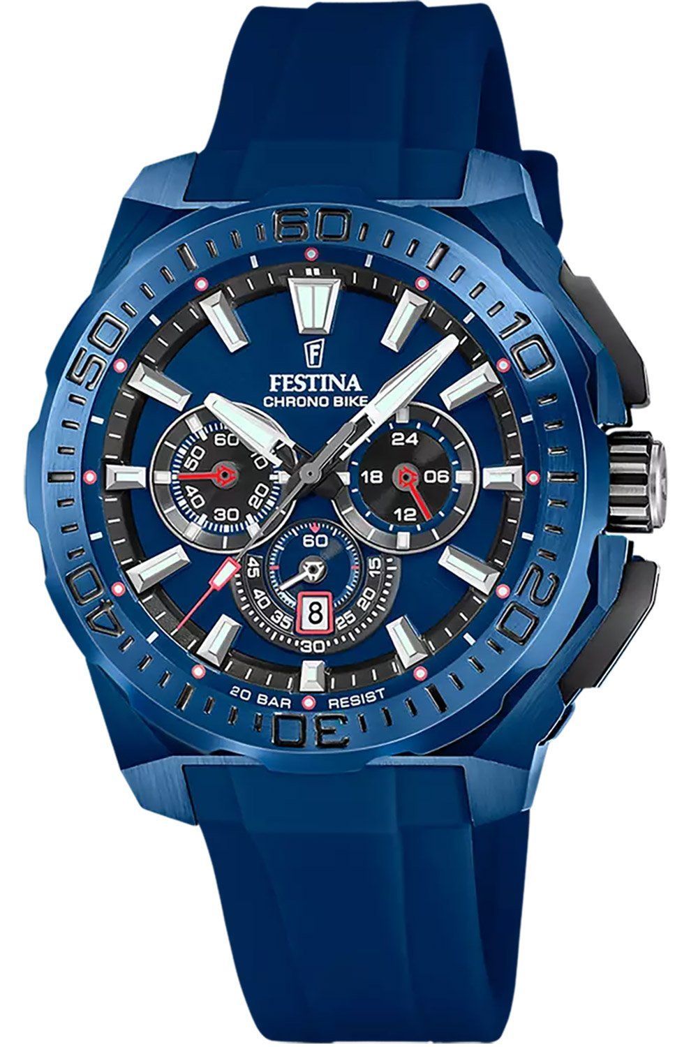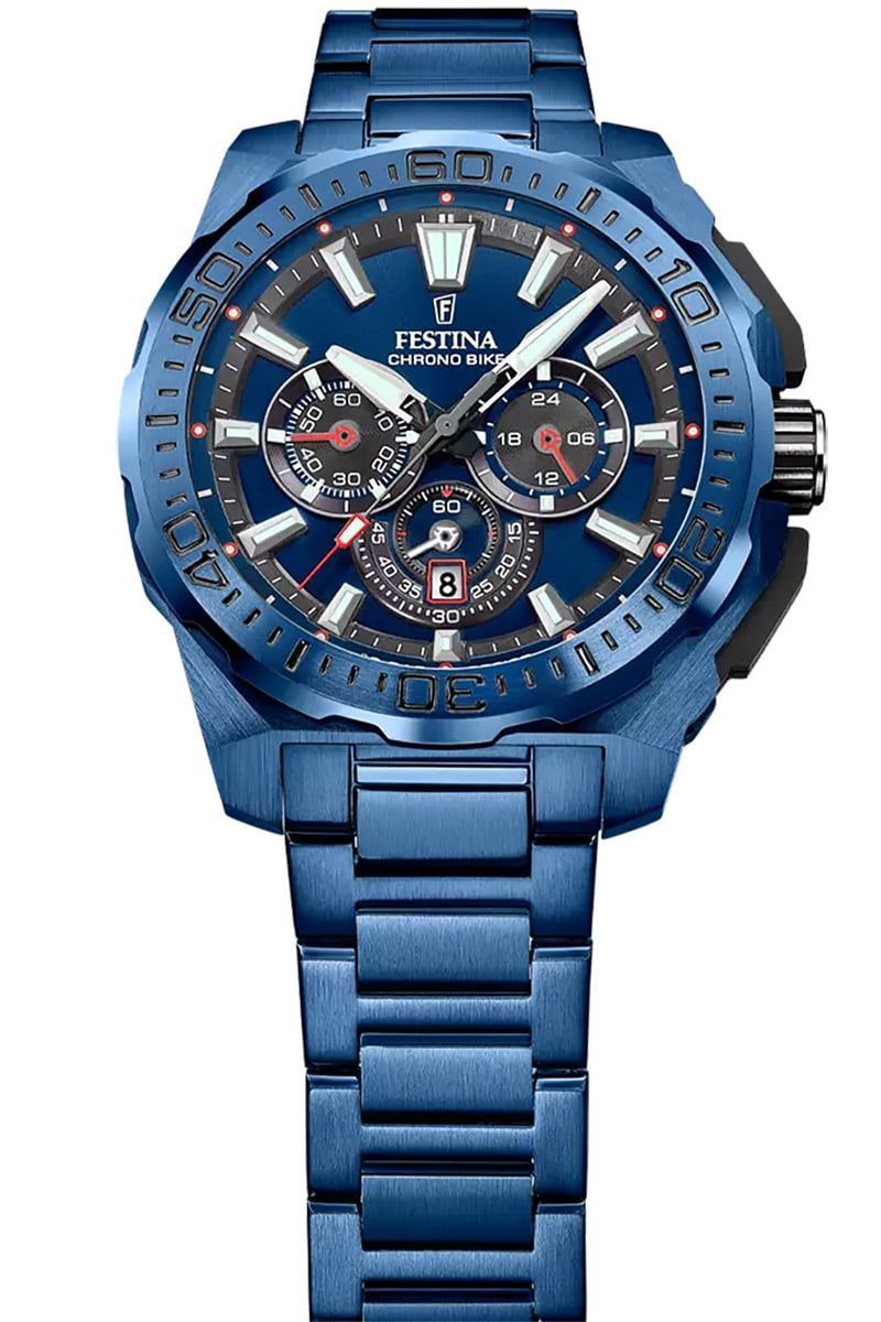 coole Armbanduhr für Männer mit 2 Bändern, aus der Kollektion Chrono Bike, präzises Quarzwerk, Datumsanzeige, Stoppfunktion bis zu 60 Minuten in Sekundenschritten, 24-Stunden-Anzeige, dunkelblaues Sunray-Zifferblatt, schwarz akzentuierte Hilfszifferblätter, lumineszierende Zeiger und Indizes, kleine Sekundenanzeige, mattiertes Edelstahlgehäuse, blau plattiert, Lünette mit Minutenskala, verschraubter Gehäuseboden, verschraubte Krone mit Logo, kratzunempfindliches Mineralglas, Armband aus mattiert