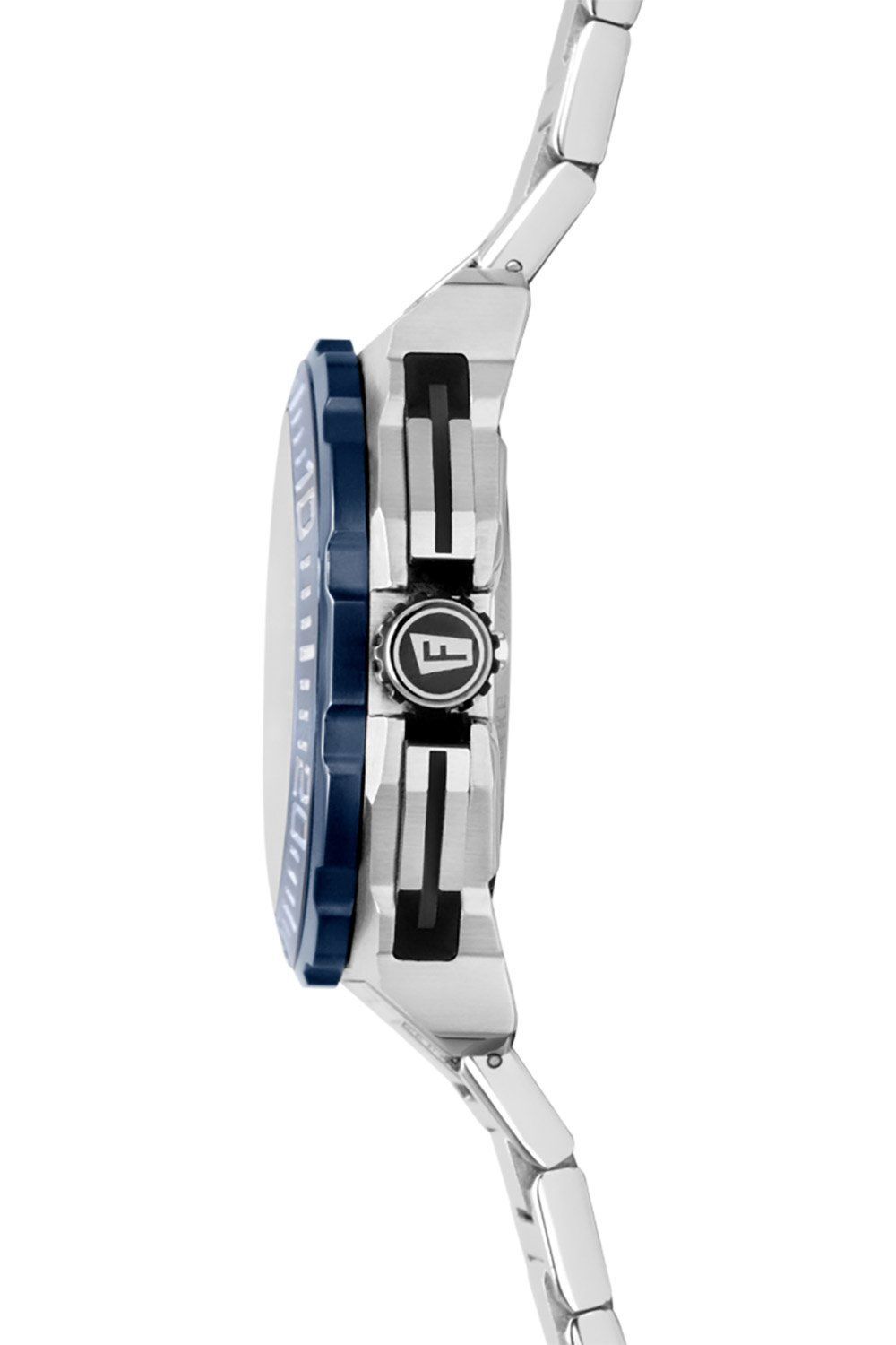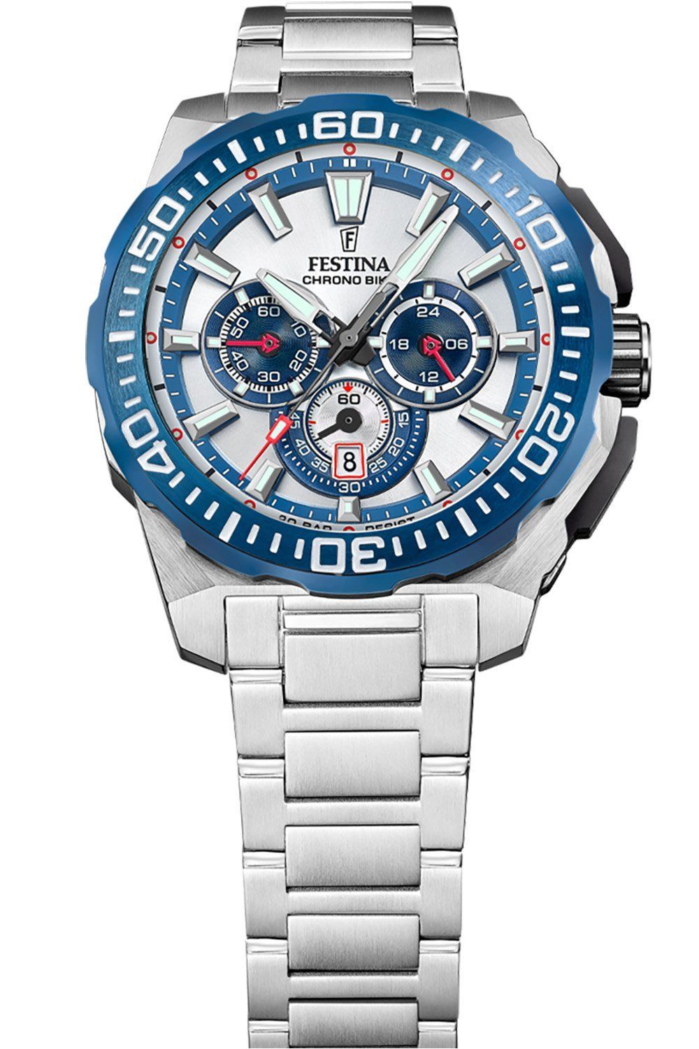 coole Armbanduhr für Männer, aus der Kollektion Chrono Bike, präzises Quarzwerk, Datumsanzeige, Stoppfunktion bis zu 60 Minuten in Sekundenschritten, 24-Stunden-Anzeige, silberfarbenes Sunray-Zifferblatt, blau akzentuierte Hilfszifferblätter, lumineszierende Zeiger und Indizes, kleine Sekundenanzeige, mattiertes Edelstahlgehäuse, blaue Lünette mit Minutenskala, verschraubter Gehäuseboden, verschraubte Krone mit Logo, kratzunempfindliches Mineralglas, Armband aus mattiertem Edelstahl, polierte De