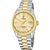Swiss Made, edle Uhr für Männer, präzises Schweizer Quarzwerk Ronda 705, Datumsanzeige mit Lupe, goldfarbenes Sunray-Zifferblatt, lumineszierende Zeiger und Indizes, zentraler Sekundenzeiger, poliertes Edelstahlgehäuse, matte Bandansätze, gezahnte, gold plattierte Lünette, verschraubter Gehäuseboden, verschraubte Krone mit Flankenschutz und Logo, kratzfestes Saphirglas, Armband aus teilmattiertem Edelstahl, mittig gold plattiert, Sicherheitsfaltschließe mit Logo, wasserdicht bis 10 bar, Breite (