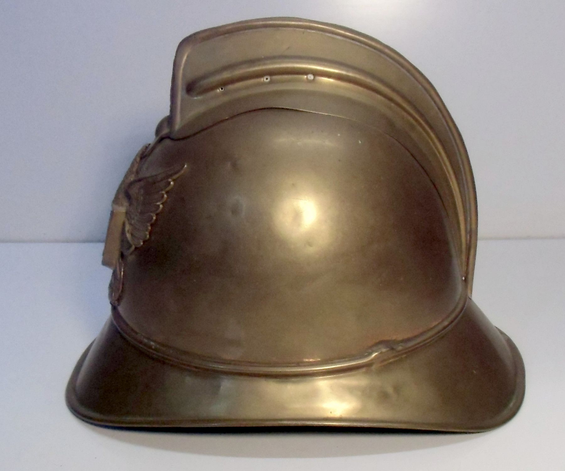 Feurwehr-Helm aus Messing, um1900. Inschrift: Vale de Cambra (Portugal). Maße: H 21 cm. Antikes am Deich - Inh: Oliver Kipp-Trense