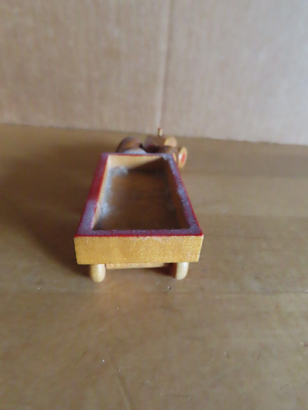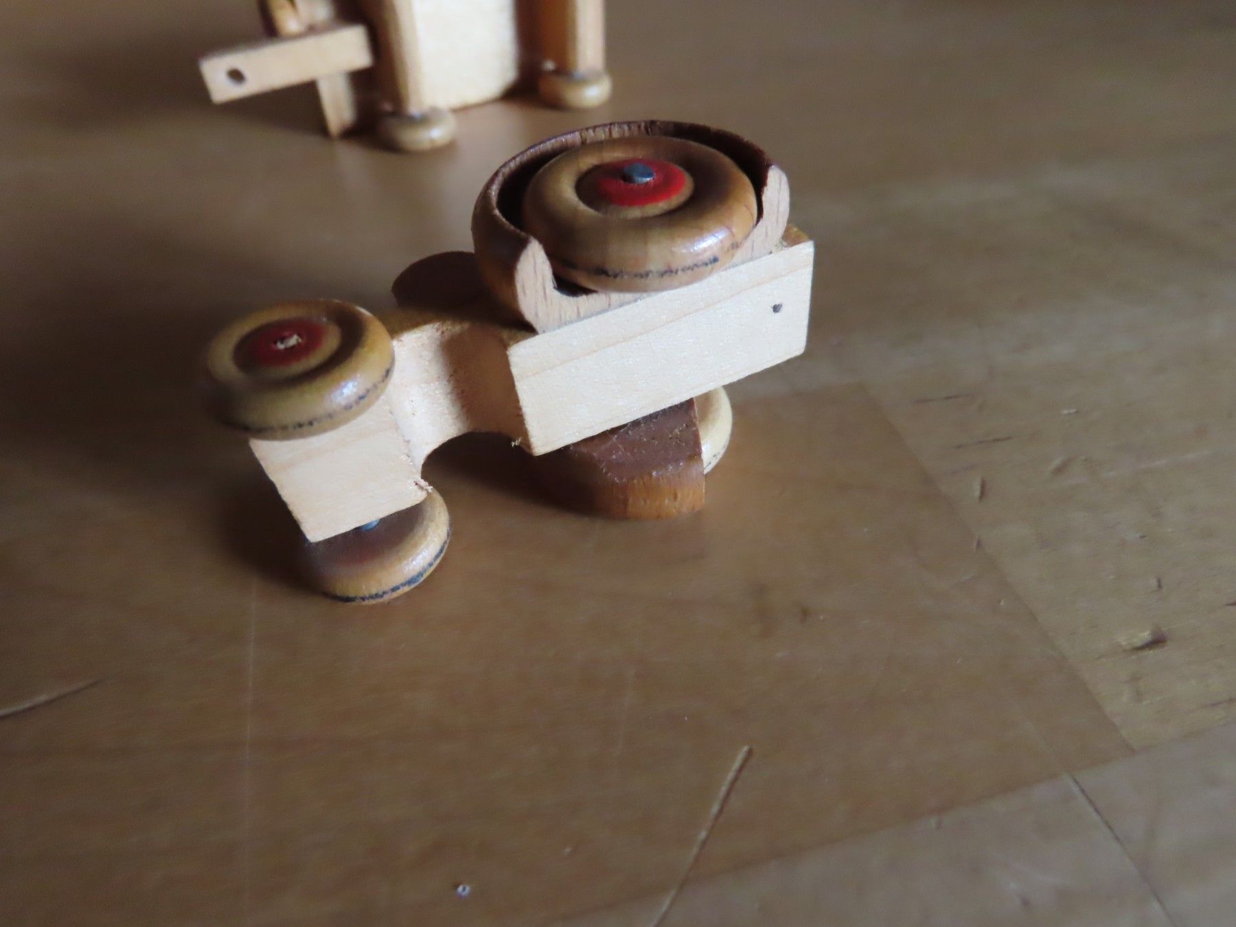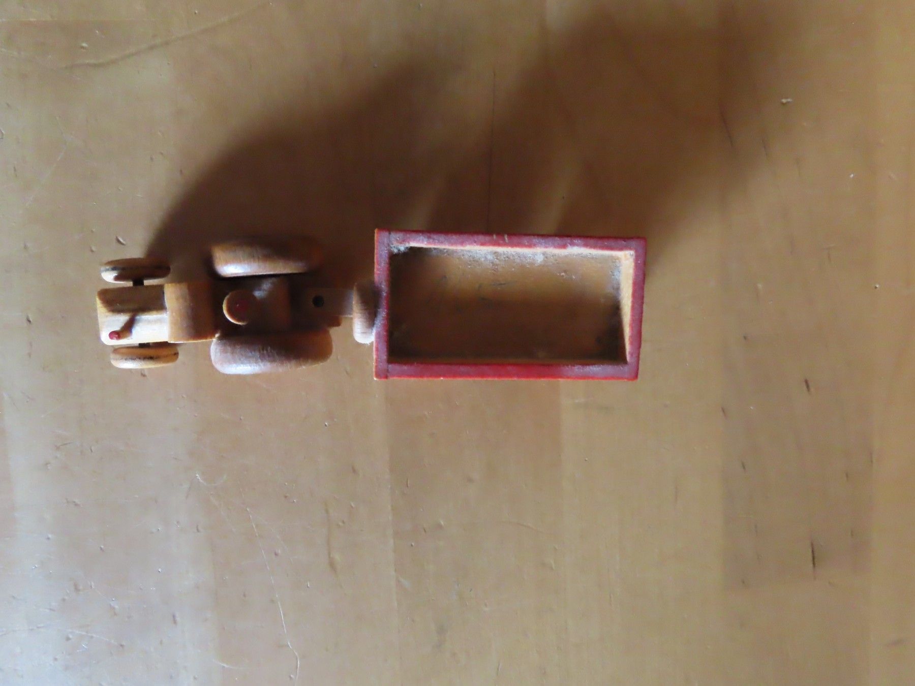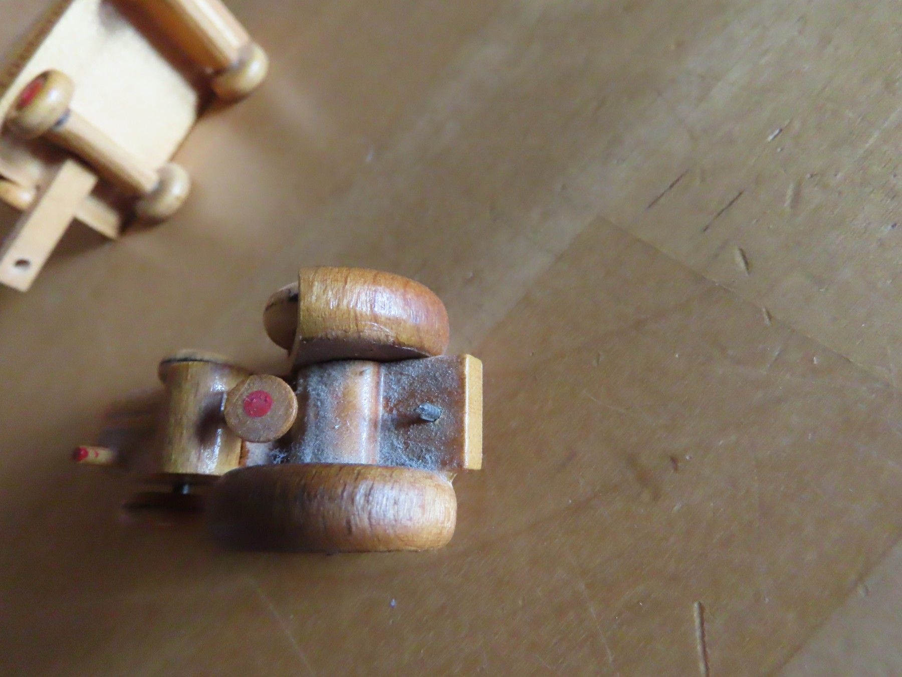 Maße: ca. 2,1 cm Hoch x ca. 10 cm x ca. 2,8 cm -- Material: Holz ist leicht verschmutzt verstaubt, hat feine Kratzer, auf dem Hänger steht eine Zahl, an einem Rad müsste etwas wieder geklebt werden