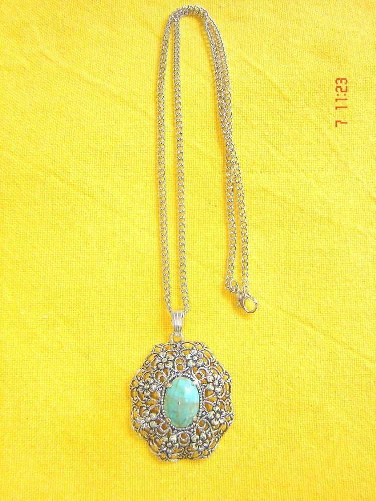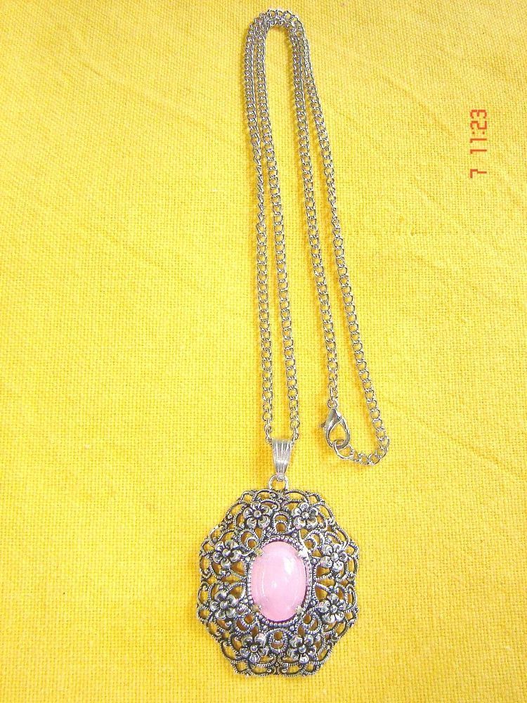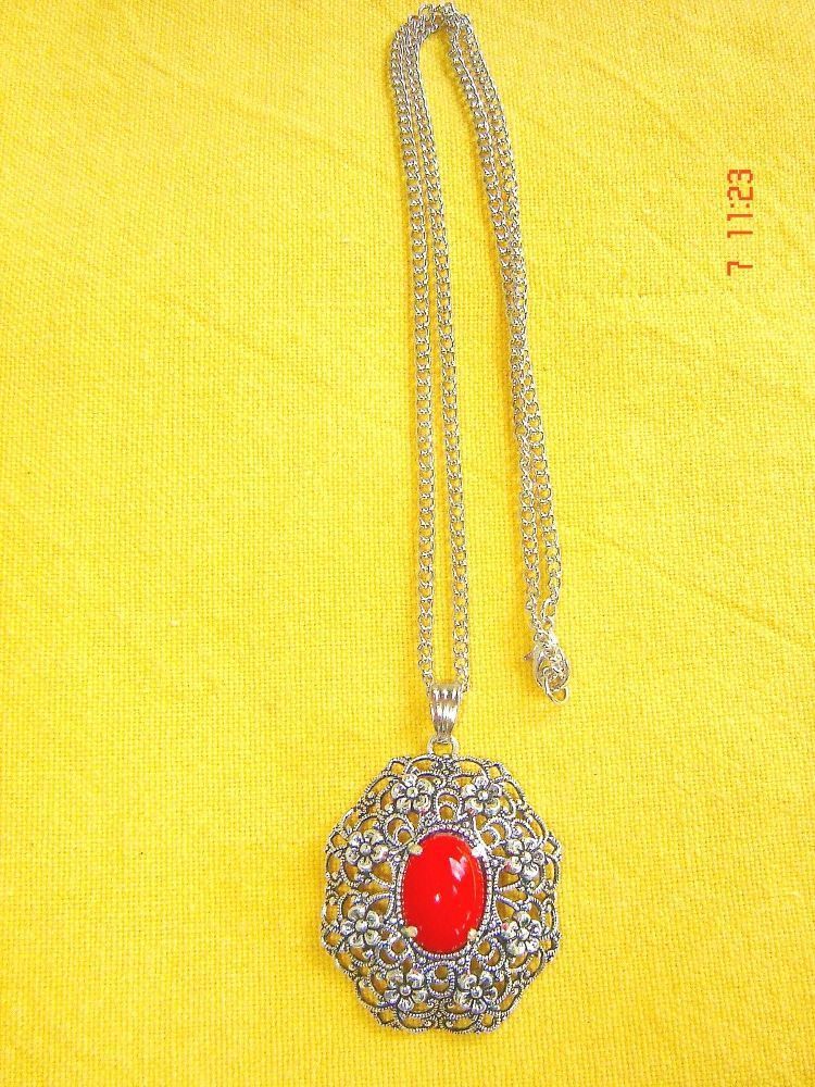 Trachtenschmuck , Dirndlschmuck , Landhausmode wunderschöne traditionelle Dirndlkette wunderbare alte Fassung , fein filigran ausgearbeitet mit Blümchen und durchbrochen gearbeitet mit einem Kunstglas Muggel , wahlweise in Farbe rose , türkis oder rot der Anhänger ist ca 3cm breit und gesamt ca 4,4