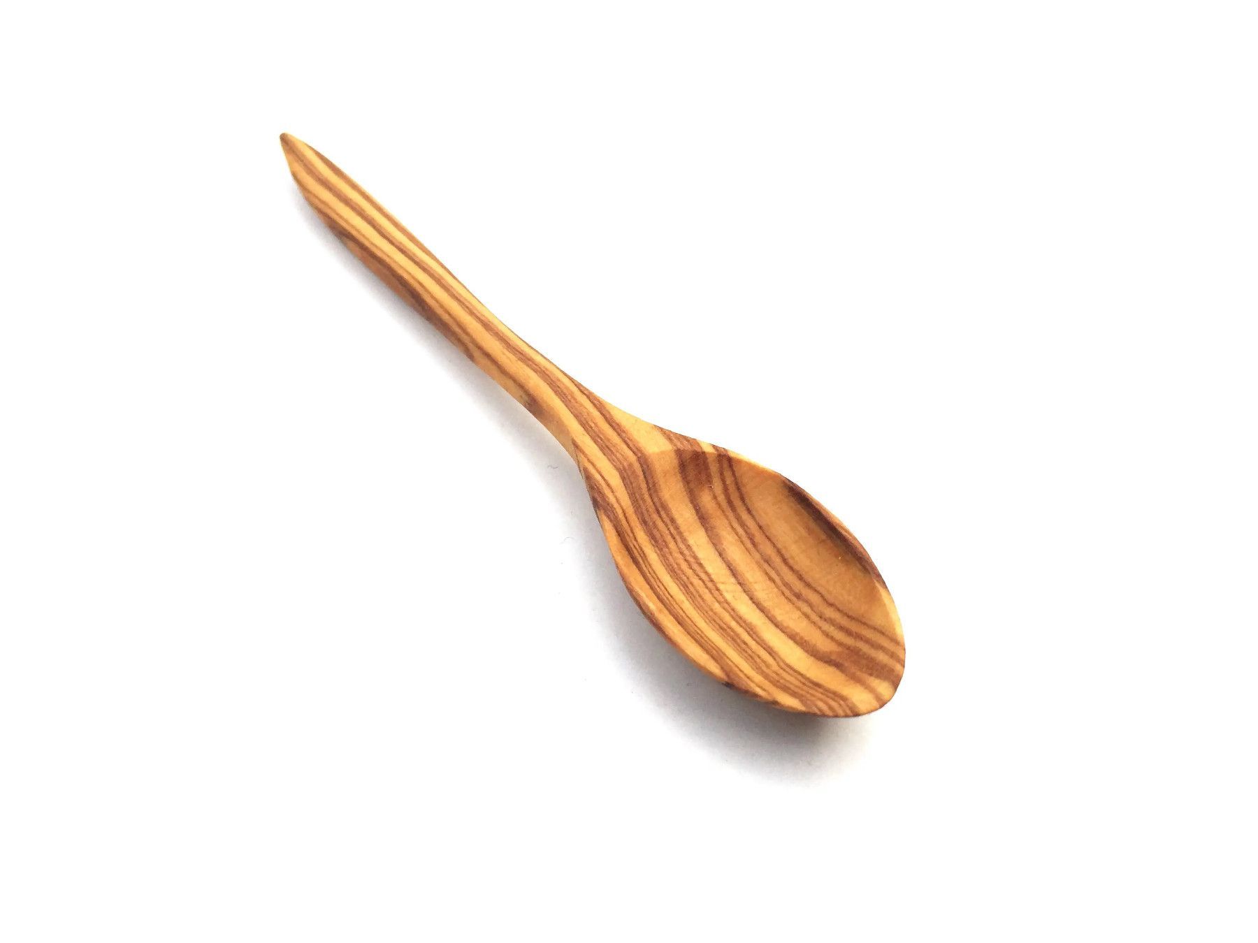 Löffel Der Löffel aus Olivenholz und in Handarbeit angefertigt. Die künstlerisch begabten Handwerker haben jedes Stück einzeln per Hand hergestellt, was jedes Stück zu einem Unikat macht. Die einzigartige rötlich-braune Maserung mit einem unregelmäßigen Faserverlauf auf glatter Oberfläche macht den