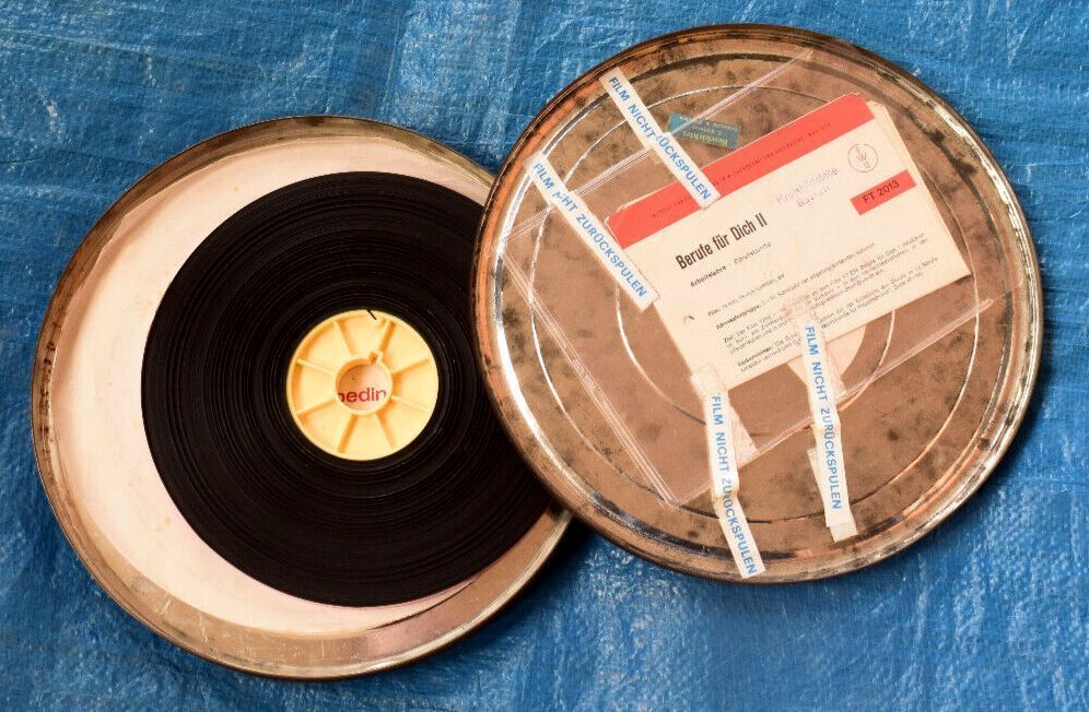 Filmsdose aus Metall grau mit Film beschriftet Institut für Film Bild Wissenschaft Unterricht Kreisfilm Bildstelle: Berufe für Dich II Laufzeit ca. 20min Filmdose aus Metall Durchmesser : d: ca. 35 cm Zustand: gebraucht mit Gebrauchsspuren und gutem Zustand. - alters- und lagerungsbedingte Gebrauchs