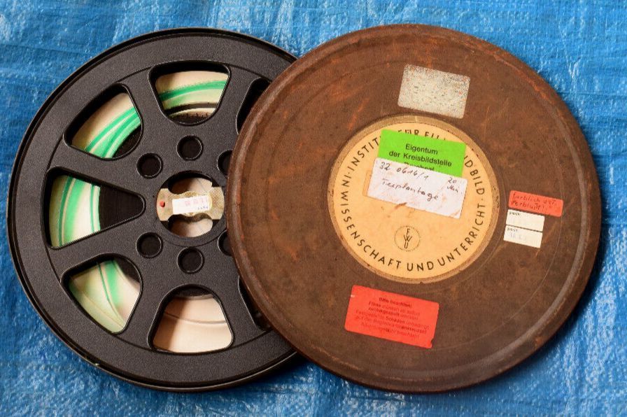 Filmdose mit Film Teeplantage 20min d: ca. 35cm - aus Metall grau gebraucht