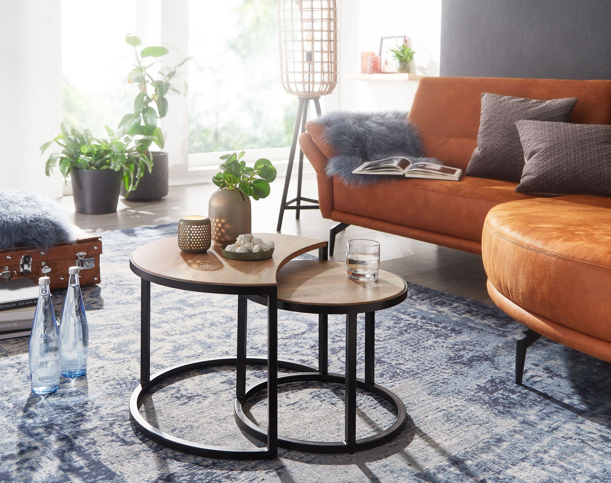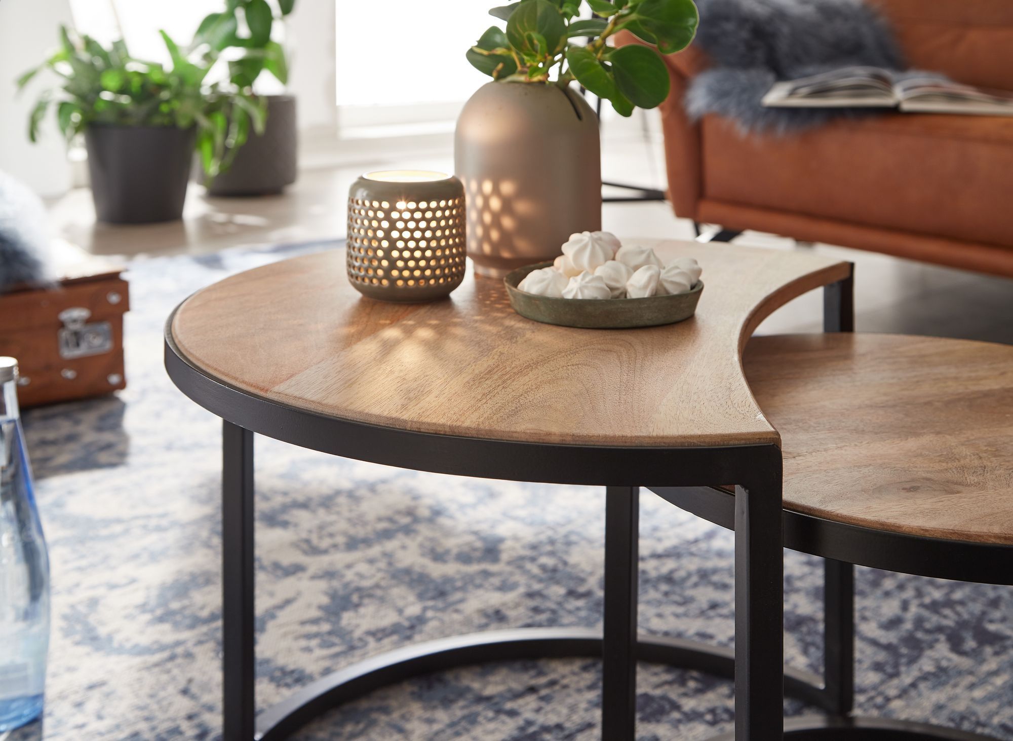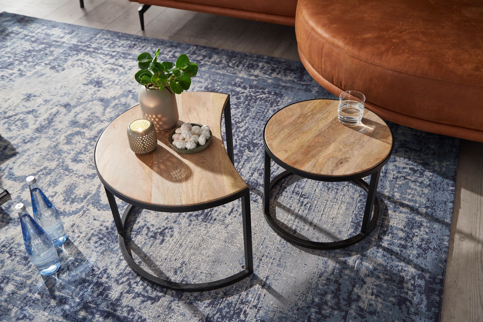 FineBuy Couchtisch Set 2er Mango Massivholz rund Natur · Wohnzimmertisch Beistelltisch mit Metallgestell Schwarz · Satztische im Industrial Design