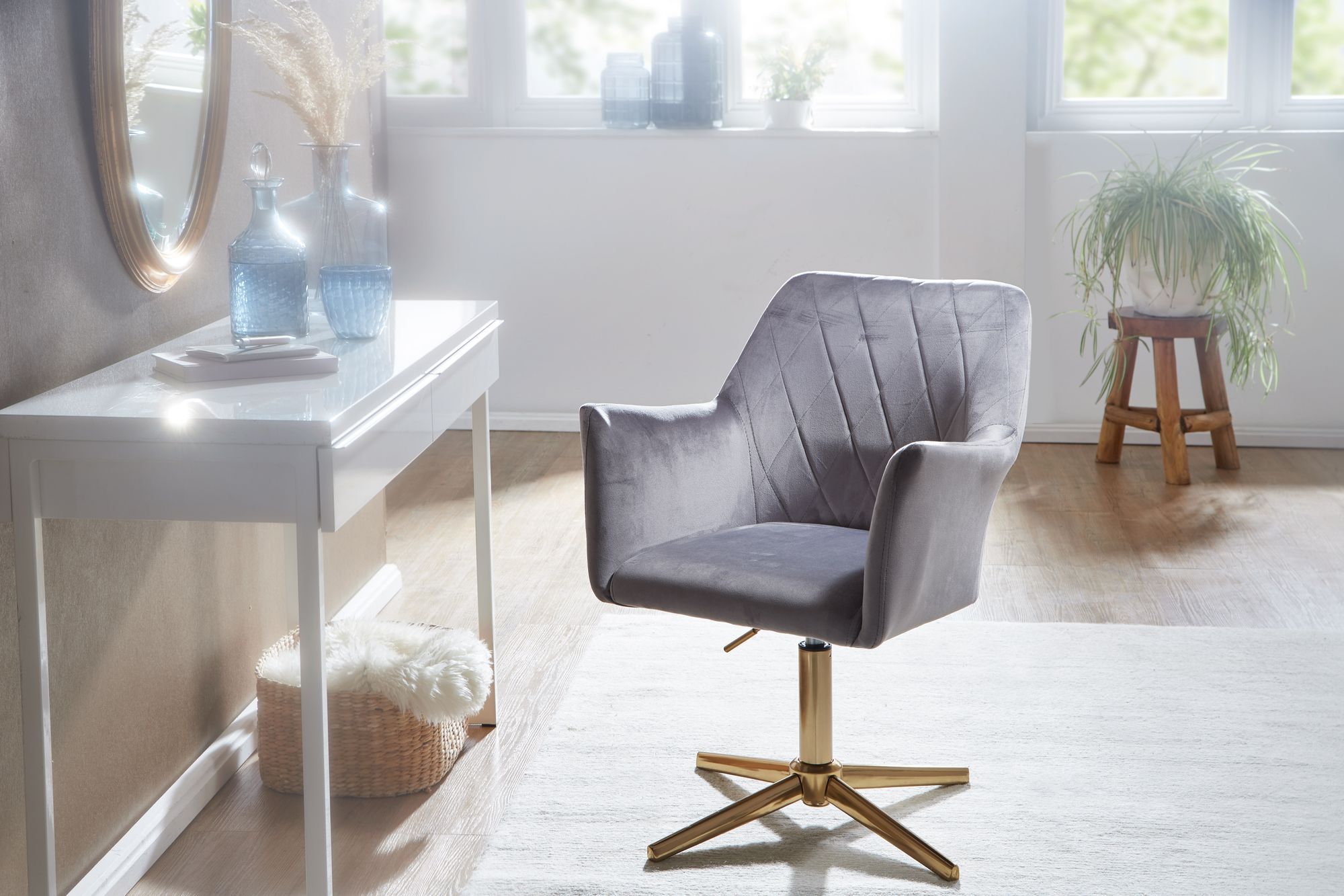 FineBuy Schreibtischstuhl Samt Design Drehstuhl mit Lehne, Schalenstuhl 120 kg Höhenverstellbar, Arbeitsstuhl ohne Rollen, Stuhl Schreibtisch Home-Office Drehbar
