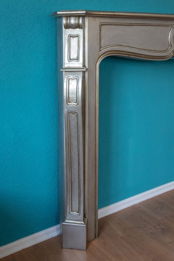 Dekorative Verzierungen und Schnitzereien geben der Kaminverkleidung ein schlichtes und prachtvolles Aussehen. Die Kaminverkleidung wurde aus Mahagoni-Holz hergestellt und ist im Silberton gehalten. Gesamthöhe ca. 136 cm Gesamtbreite ca. 195 cm Gesamttiefe ca. 23 cm Innenhöhe ca. 109 cm Innenbreite