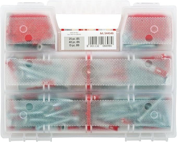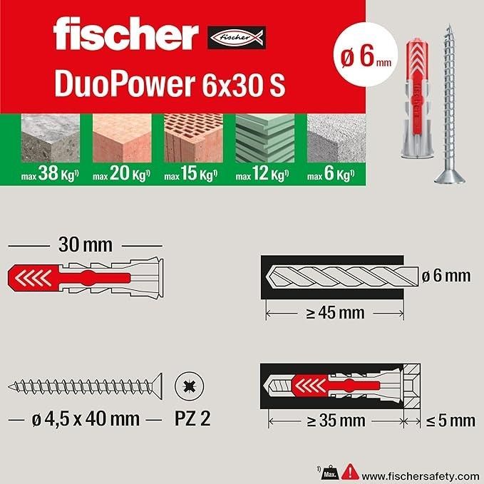 Set mit 80 Duopower Dübel mit Schraube (insgesamt 160 Stück, Stop + Schrauben); perfekt für die Befestigung an Vollwand oder Hohlziegel, Beton, GasbetonDübeldurchmesser: 5 mm, 6 mm, 8 mm Das Mauerloch muss den gleichen Durchmesser wie die Dübel haben. Die Verbindung von zwei verschiedenen Materialien und seine vielfältigen funktionellen Fähigkeiten (Spannung, Biegen und Knoten) erweitertdas Anwendungsspektrum auf weitere Materialien mit hoher Belastung.
