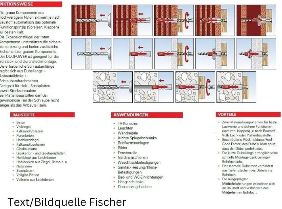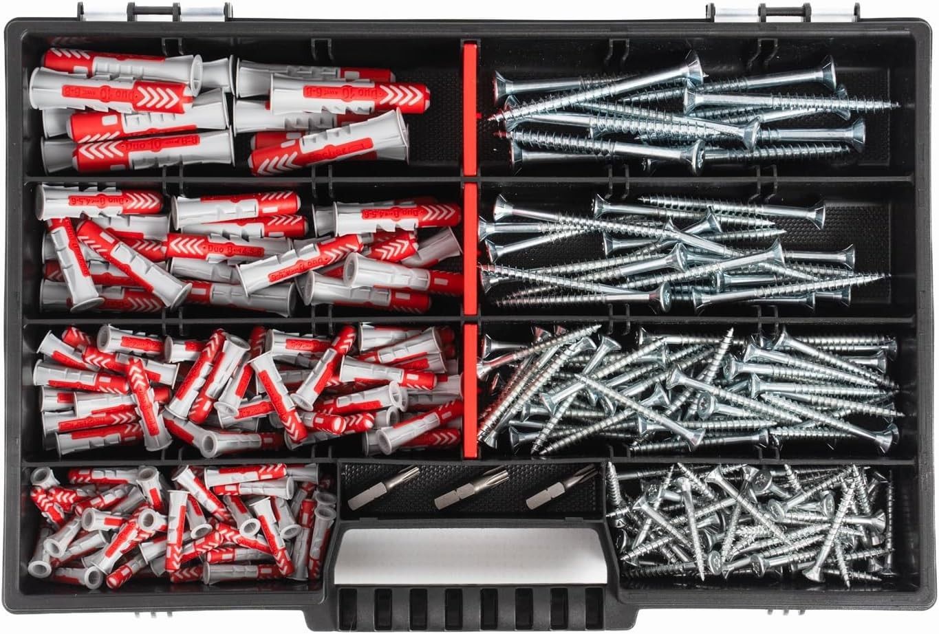 1 Sortimentskoffer mit 4 Fächern Fischer Duopower 5x25mm = 55 Stück + 55 Schrauben 4x35mm T 20 Fischer Duopower 6x30mm = 50 Stück + 50 Schrauben 4 x45mm T20 Fischer Duopower 8x40mm = 20 Stück + 20 Schrauben 5,0x60mm T20 Fischer Duopower 10x50mm = 12 Stück + 12 Schrauben 6,0x70mm T 30