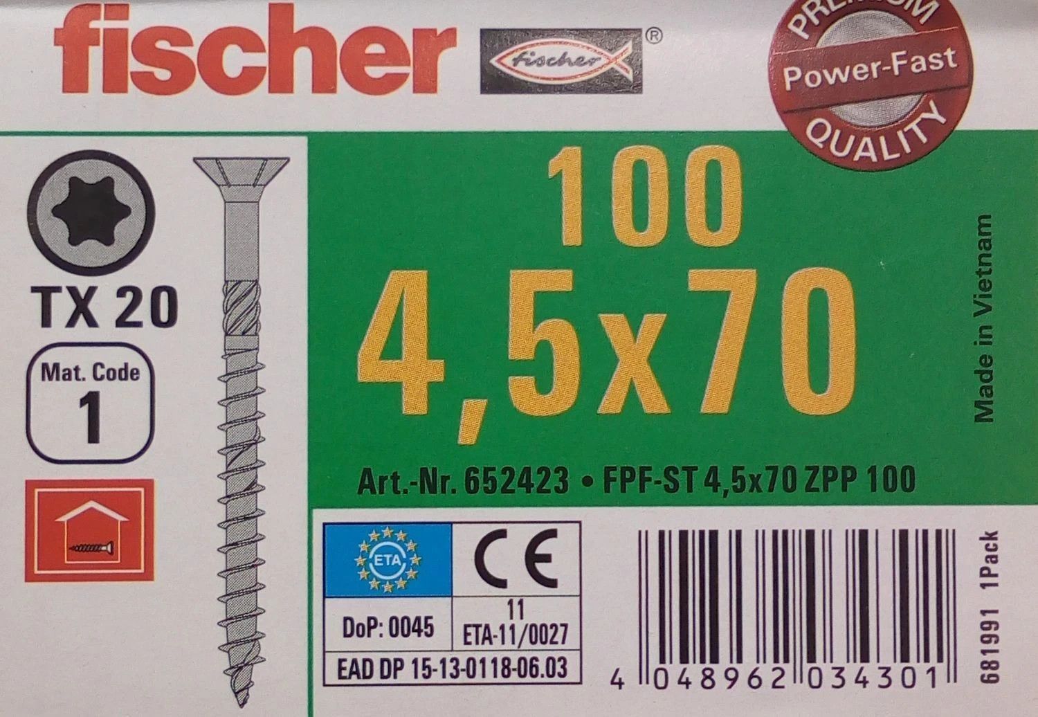 fischer PowerFast 4,5 × 70mm Holzbauschraube SK PZ TG, 20 Stück