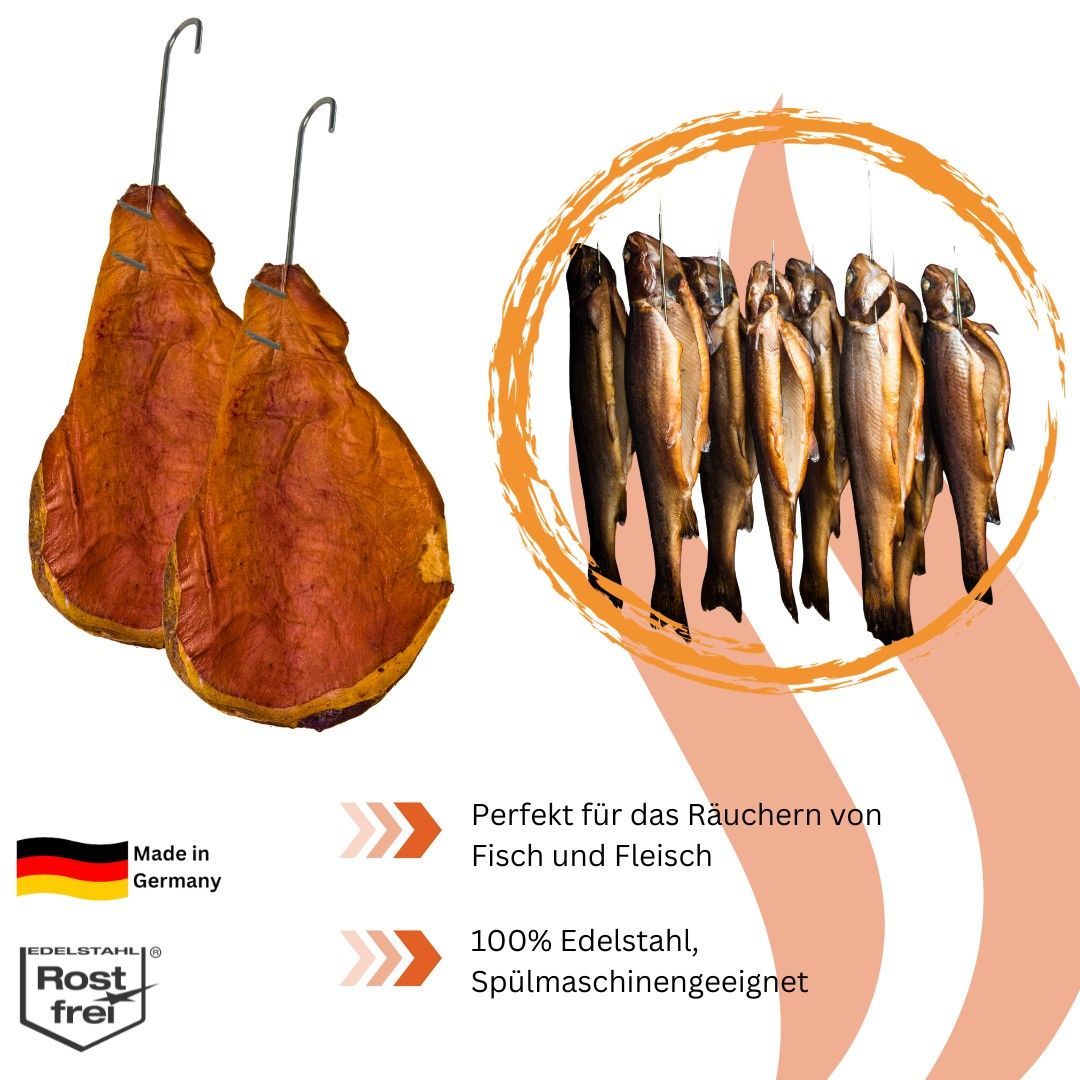 Das hochwertige Set von 10 Räucherhaken aus 100% Edelstahl ist ideal zum Aufspießen von Räuchergut. Mit einer Materialstärke von 3 mm und einer cleveren 90-Grad-gedrehten Aufhängung bieten die Haken eine optimale Handhabung. Jeder Haken hat eine Tragkraft