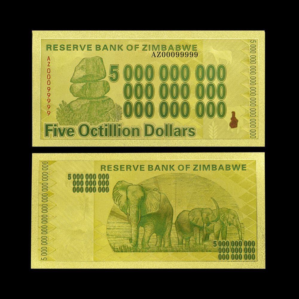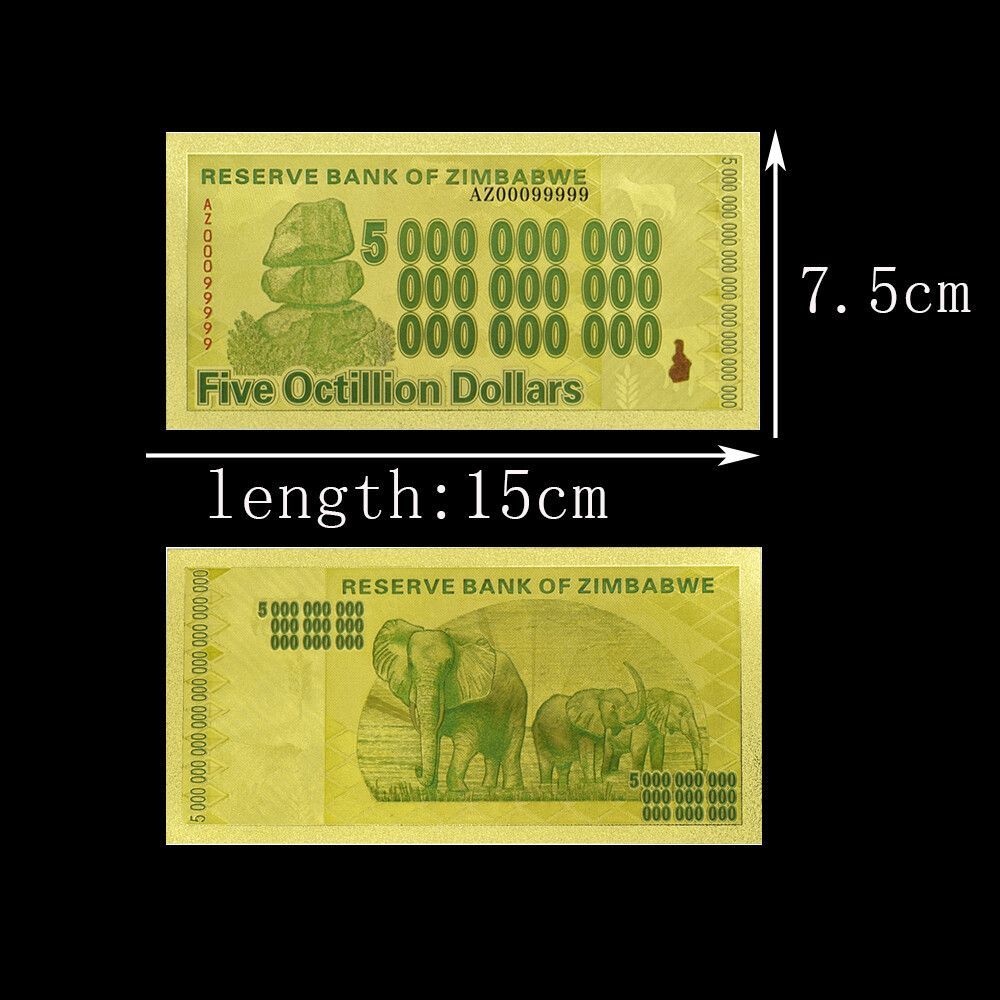 Banknote Five Octillion - Zimbabwe - Nachdruck - vergoldet Folie - sehr selten Technische Information zum Artikel Material: vergoldet Größe: ca. original Größe Erhaltung: Neu Verpackung: Folie Das ideale Geschenk oder natürlich auch zum selber sammeln Natürlich handelt es sich hier nicht um echtes G