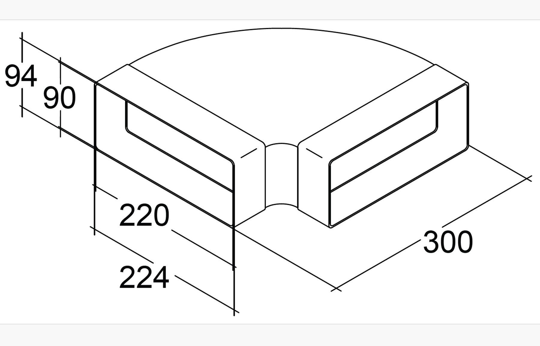 Flachkanal 220x90mm, 90° Bogen waagerecht, Lüftungsbogen Küche