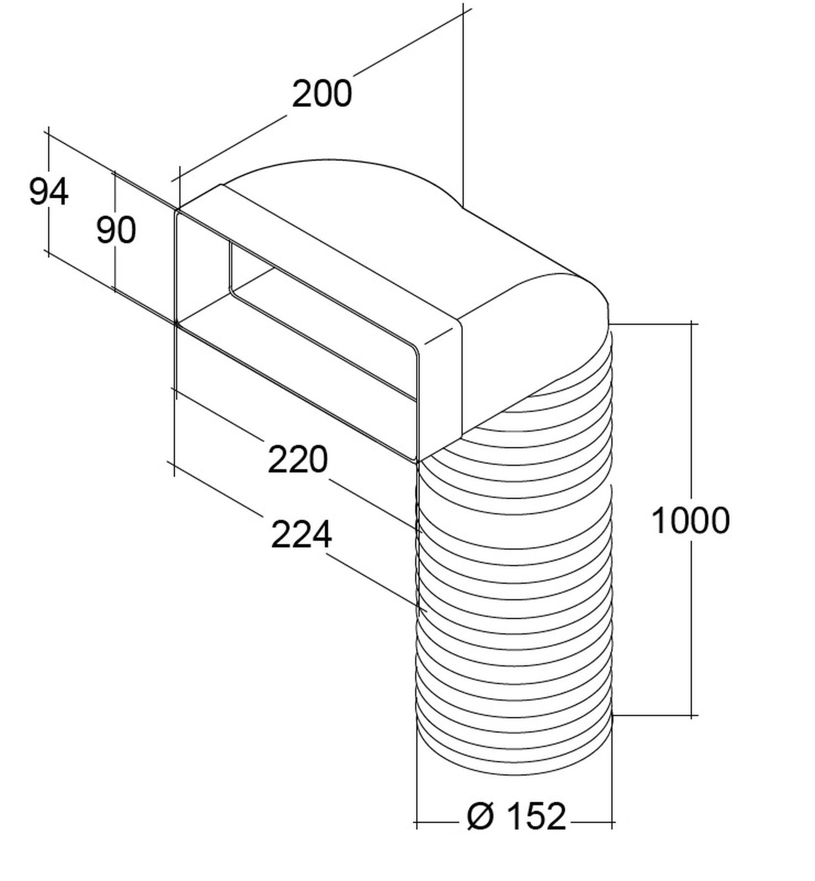 Flachkanal 220x90mm auf Ø 150mm, Umlenkstück mit 100cm Flexschlauch