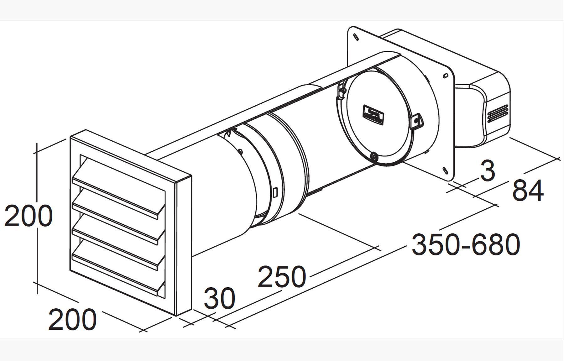 • Flachkanal 222x89mm Teleskop-Mauerkasten 350-680mm ausziehbar Dunstabzug Küche