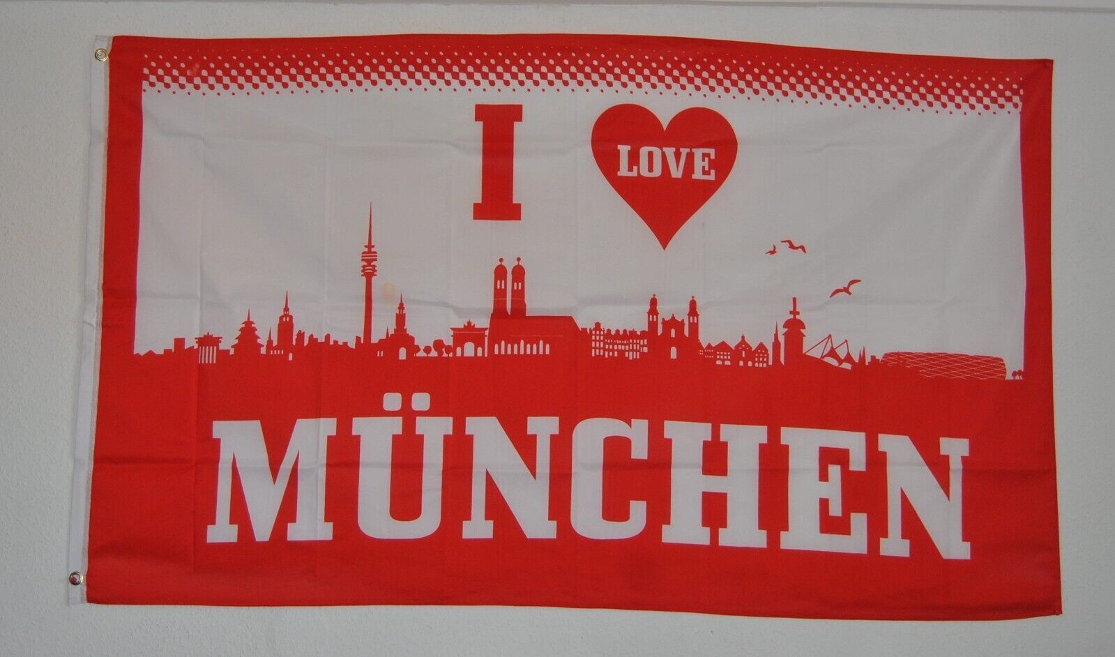 FAHNE FLAGGE I LOVE MÜNCHEN Ausführung ca. 90 x 150 cm Die Bilder gehören zur Artikelbeschreibung Die Flagge ist aus reißfestem Polyester, ist an allen Seiten gesäumt und hat zur Befestigung an der Mastseite zwei Messingösen. Waschbar bei 30°C.