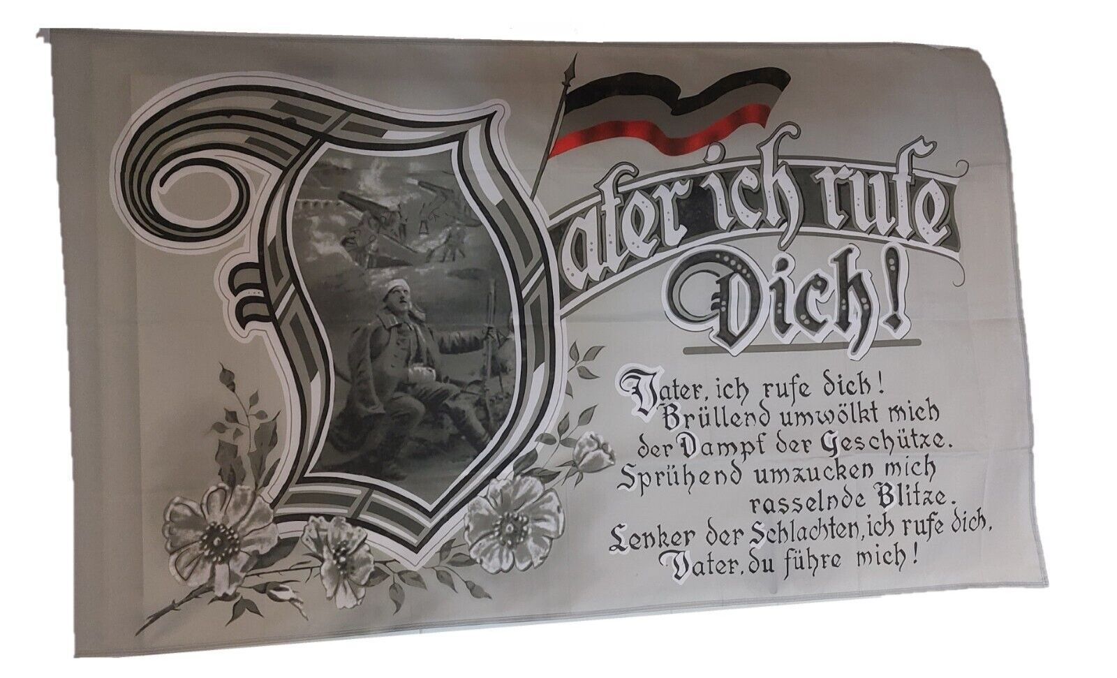 FAHNE FLAGGE Vater ich rufe Dich Vater, ich rufe dich! Brüllend umwölkt mich der Dampf der Geschütze. Sprühend umzucken mich raselnde Blitze. Lenker der Schlachten, ich rufe dich. Vater, du führe mich! Ausführung ca. 90 x 150 cm Die Flagge ist aus reißfestem Polyester, ist an allen Seiten gesäumt un