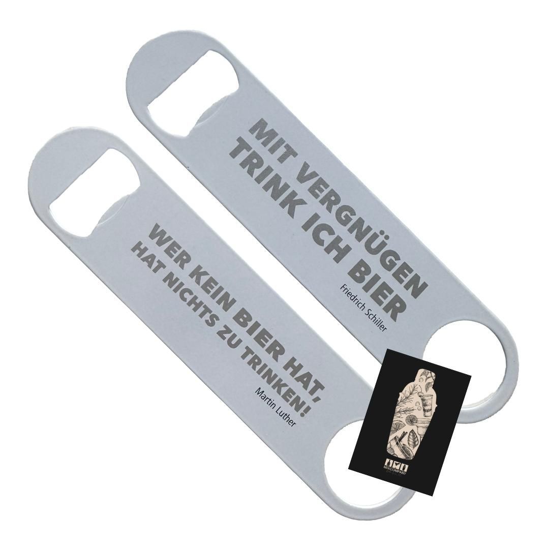 Flaschenöffner Edelstahl Weiß – Vorder- & Rückseite mit Spruch graviert
