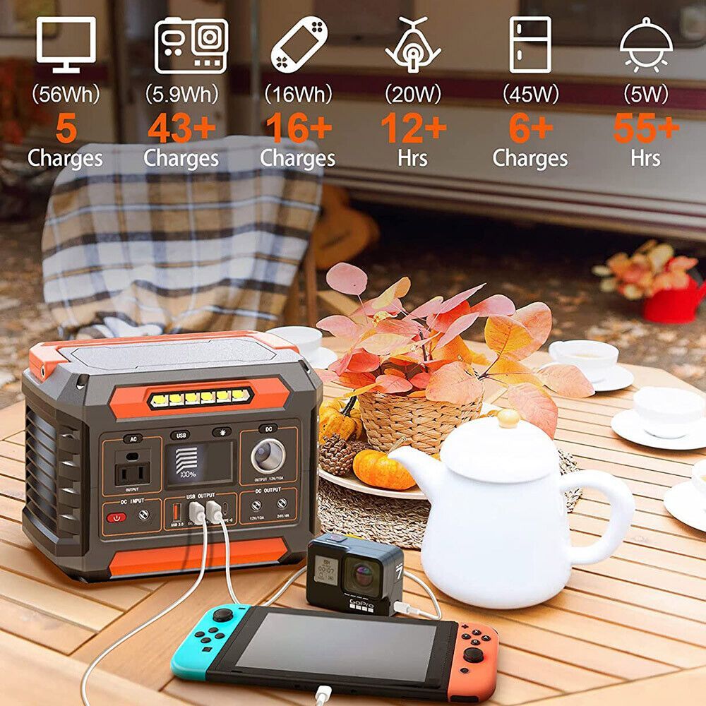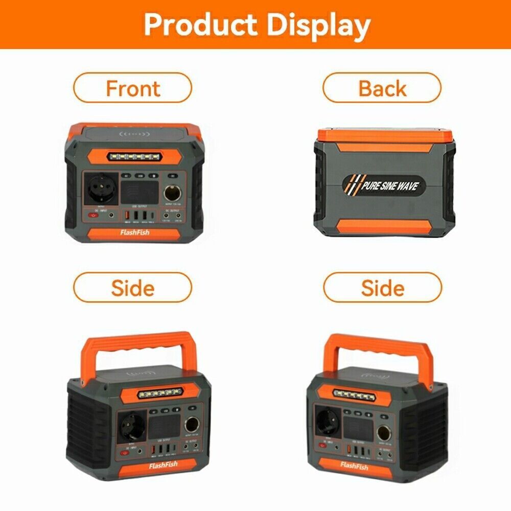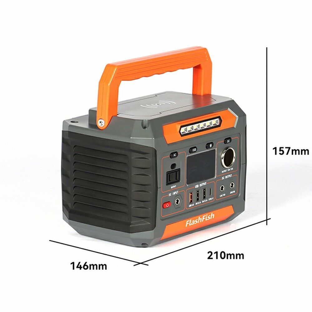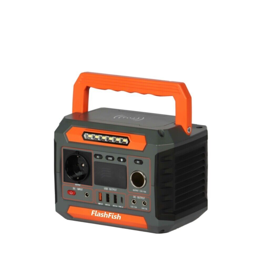 FLASHFISH Tragbare Powerstation Solargenerator 288Wh mit Wireless charger Kapazität: 288Wh (78000mAh 3.7V) AC output: 260W (Peak 500W) USB port: 1xQC3.0 (18W); 2x5V 2.1A Type-C port: 1x18W DC port: 1x12V 10A; 1x24V 4A (Max) Car port: 1x12V 10A (Max) Wireless charger: 5W DC input (PV): 13-22V Batteri