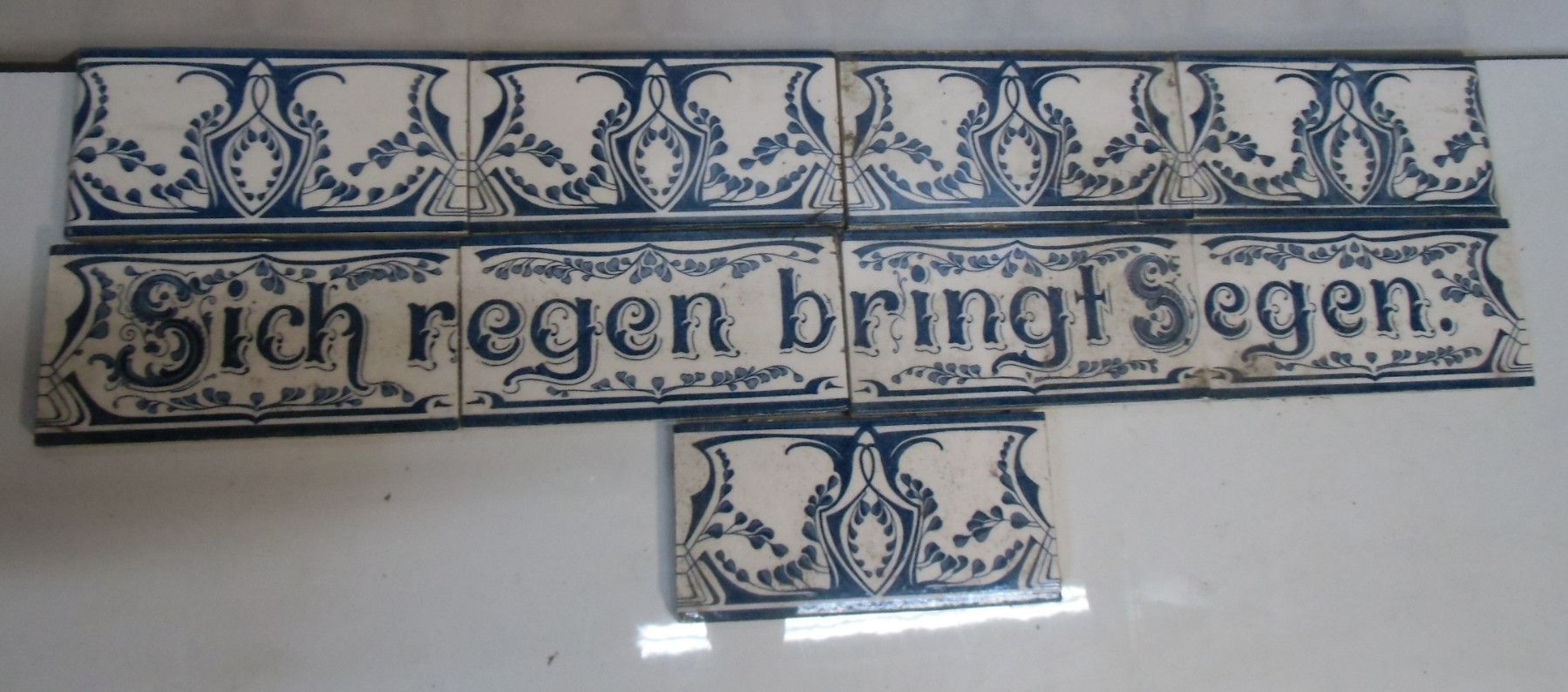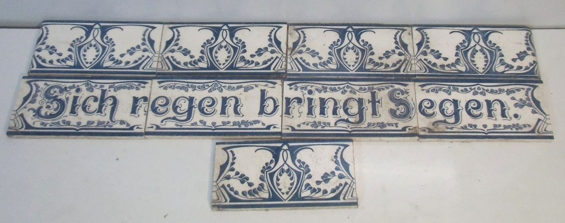 Fliesenband um 1900. Ohne Marke. Schrift: Sich regen bringt Segen. Dazu 5 Ornamente mit demselben Design. Gut erhalten. Maße: je H 7,5, B 15 cm. Antikes am Deich - Inh: Oliver Kipp-Trense