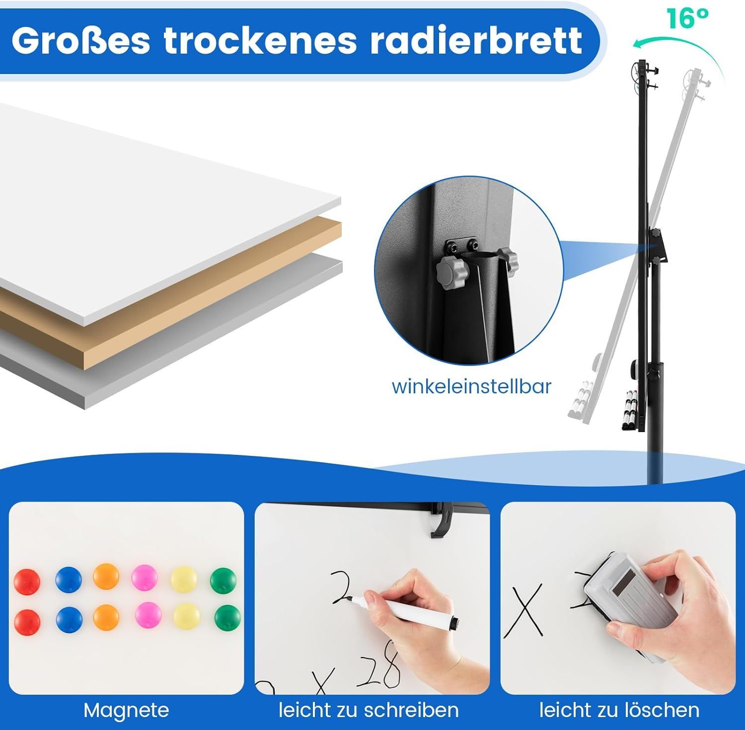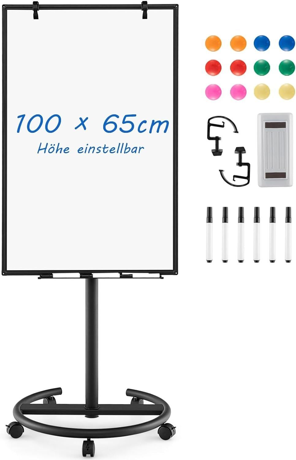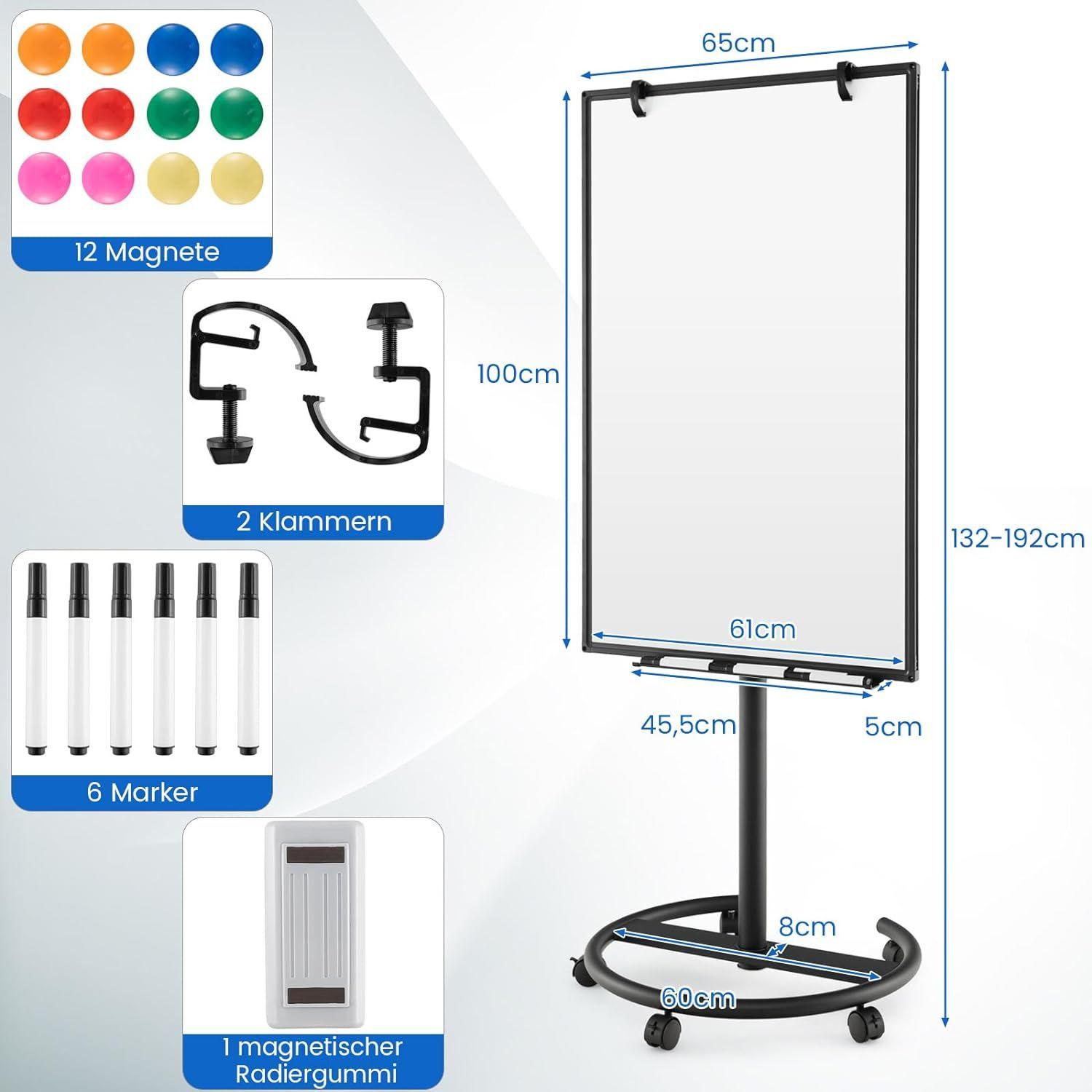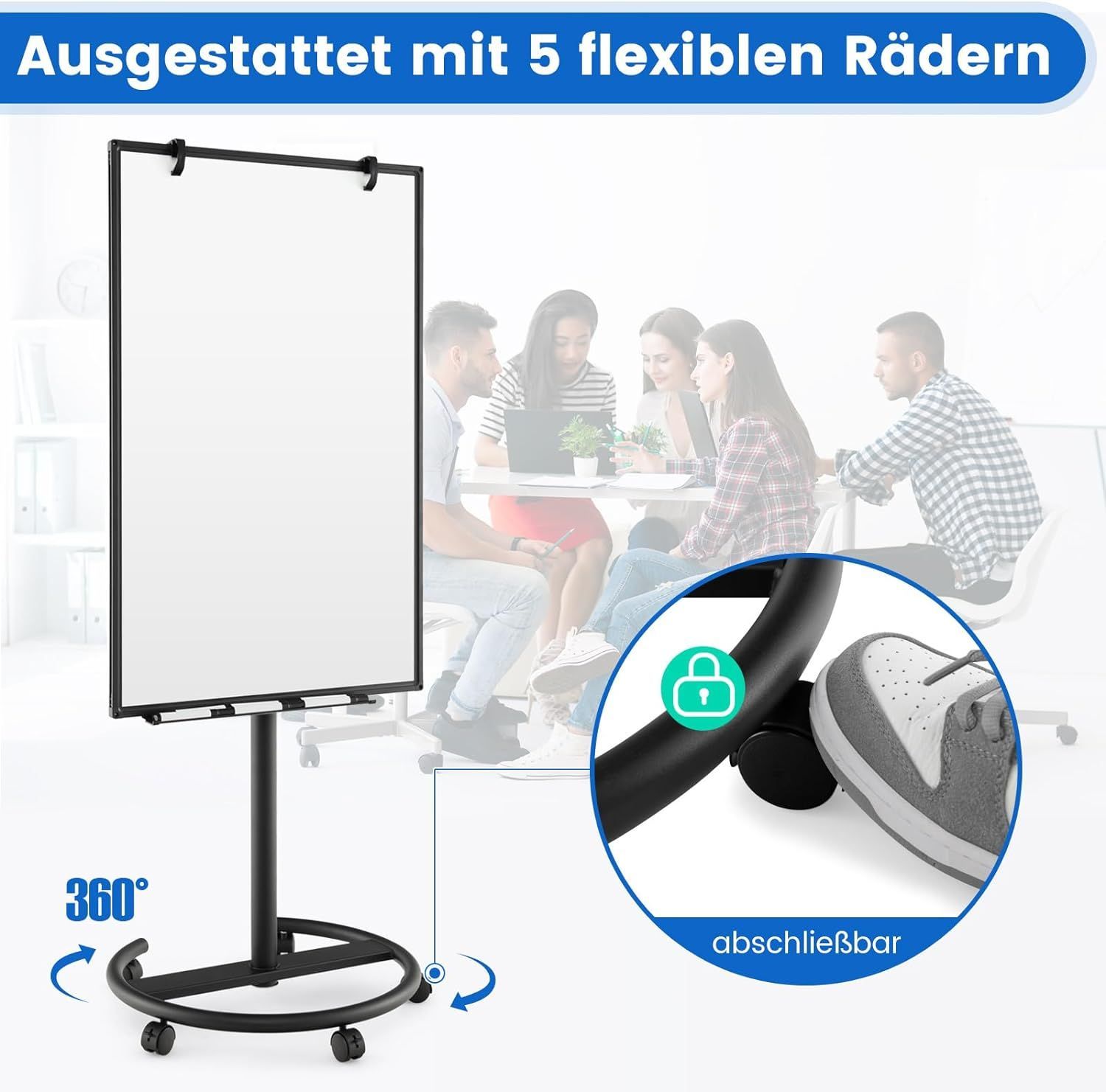 Flipchart Ständer 100x65cm, Mobiles Whiteboard auf Rollen, höhenverstellbar bis 192cm