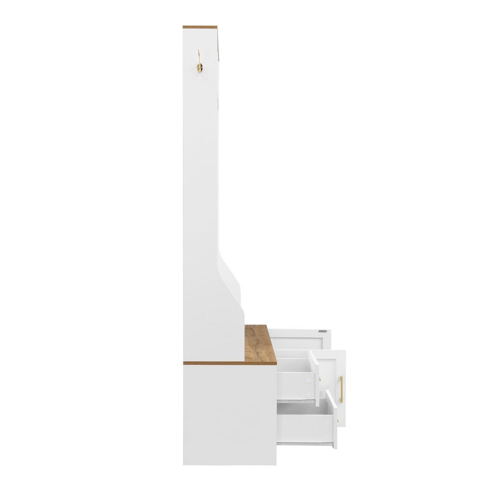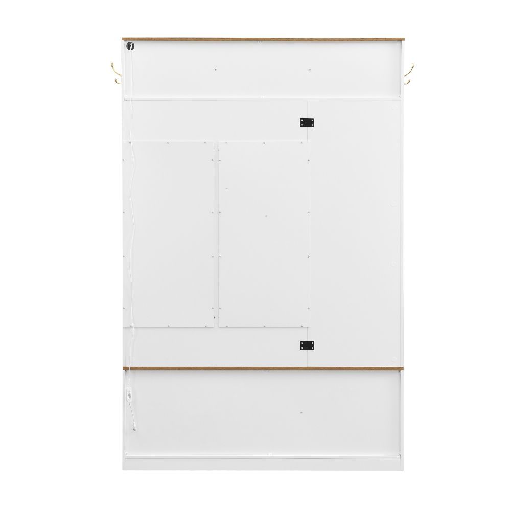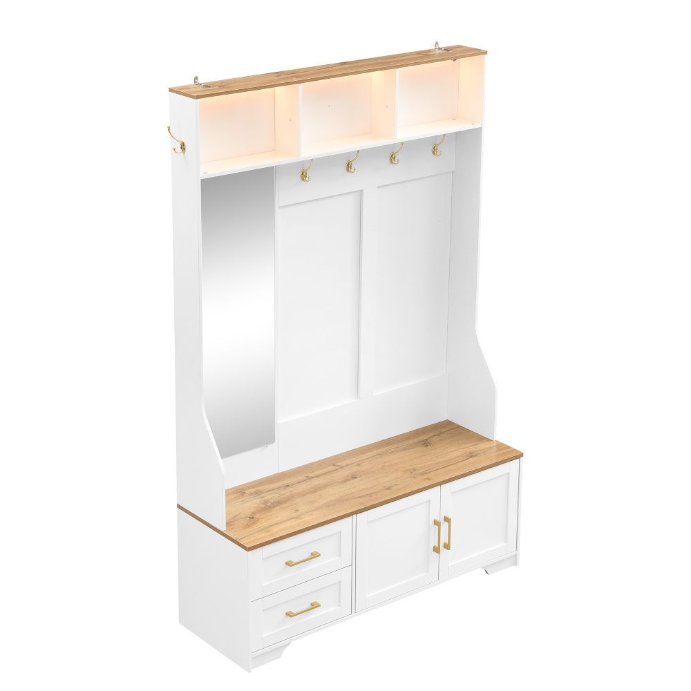 Moderner Flur- und Schuhschrank aus MDF mit LED-Beleuchtung, Spiegel, Haken, Schubladen, Stauraum und praktischer Sitzfläche. Ideal für Eingangsbereich und Diele, sorgt er für Ordnung und setzt zugleich einen stilvollen Akzent im Zuhause.