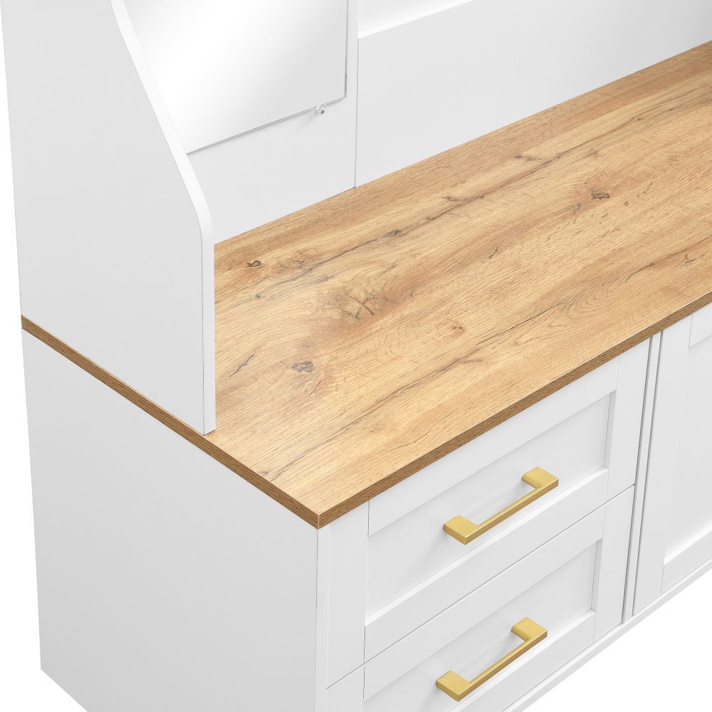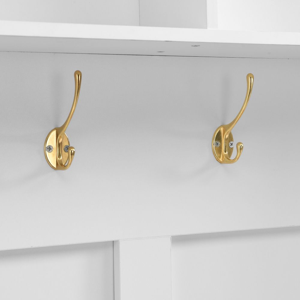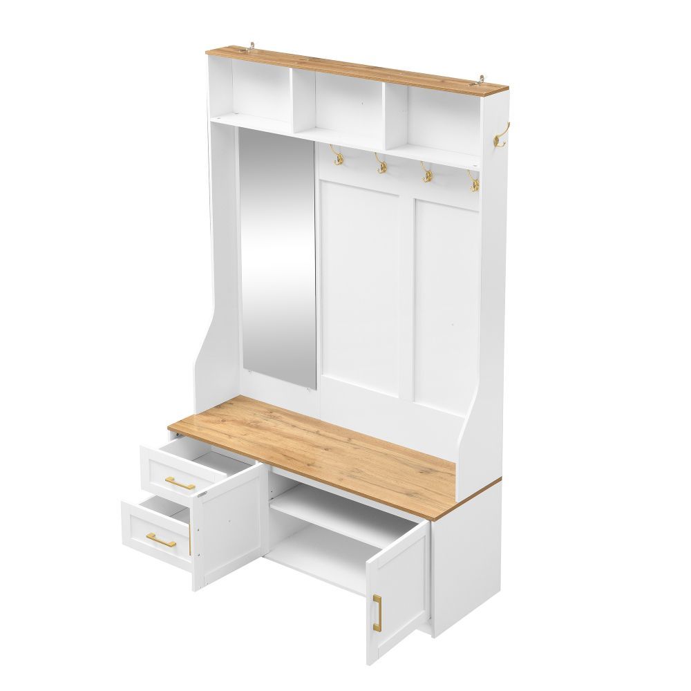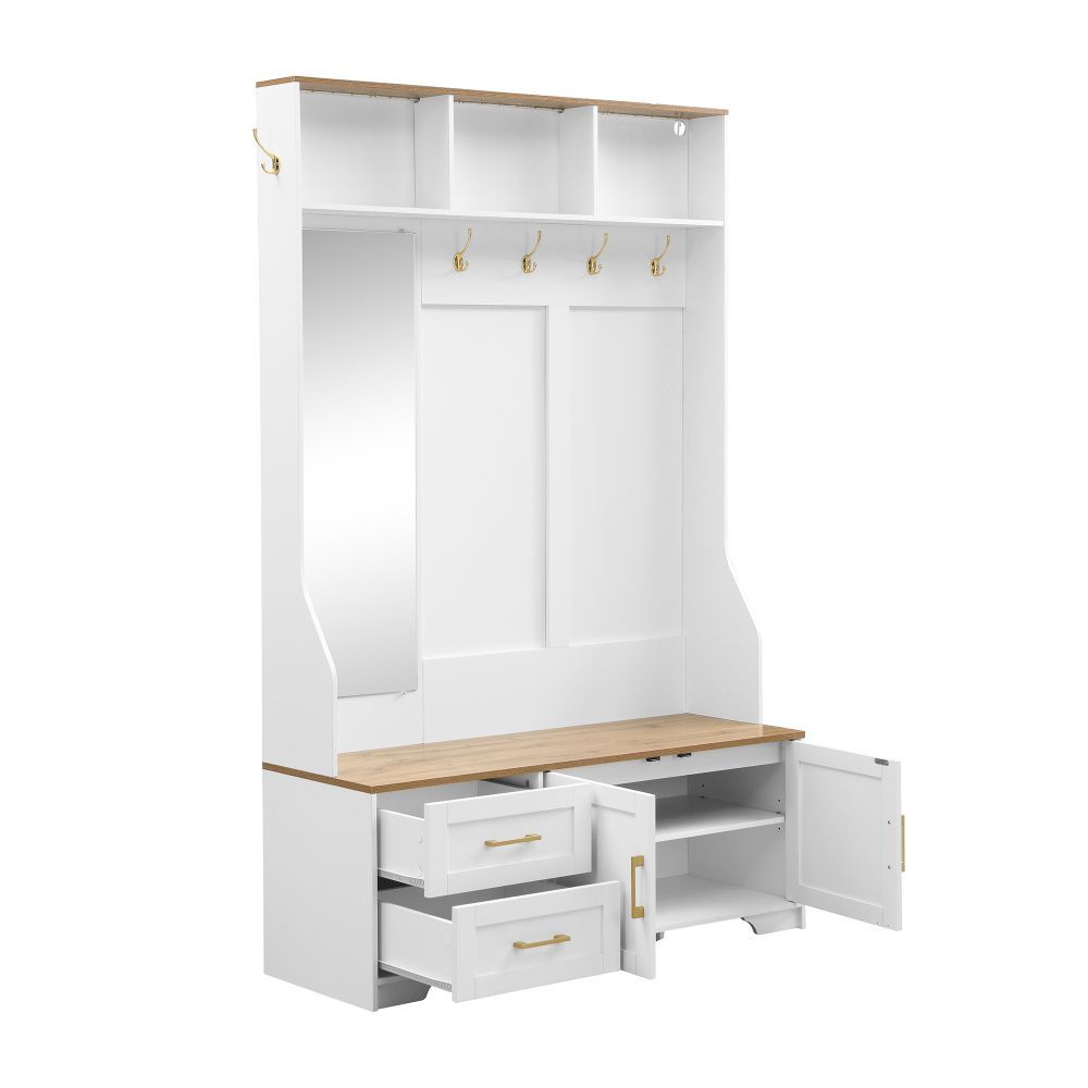 Moderner Flur- und Schuhschrank aus MDF mit LED-Beleuchtung, Spiegel, Haken, Schubladen, Stauraum und praktischer Sitzfläche. Ideal für Eingangsbereich und Diele, sorgt er für Ordnung und setzt zugleich einen stilvollen Akzent im Zuhause.