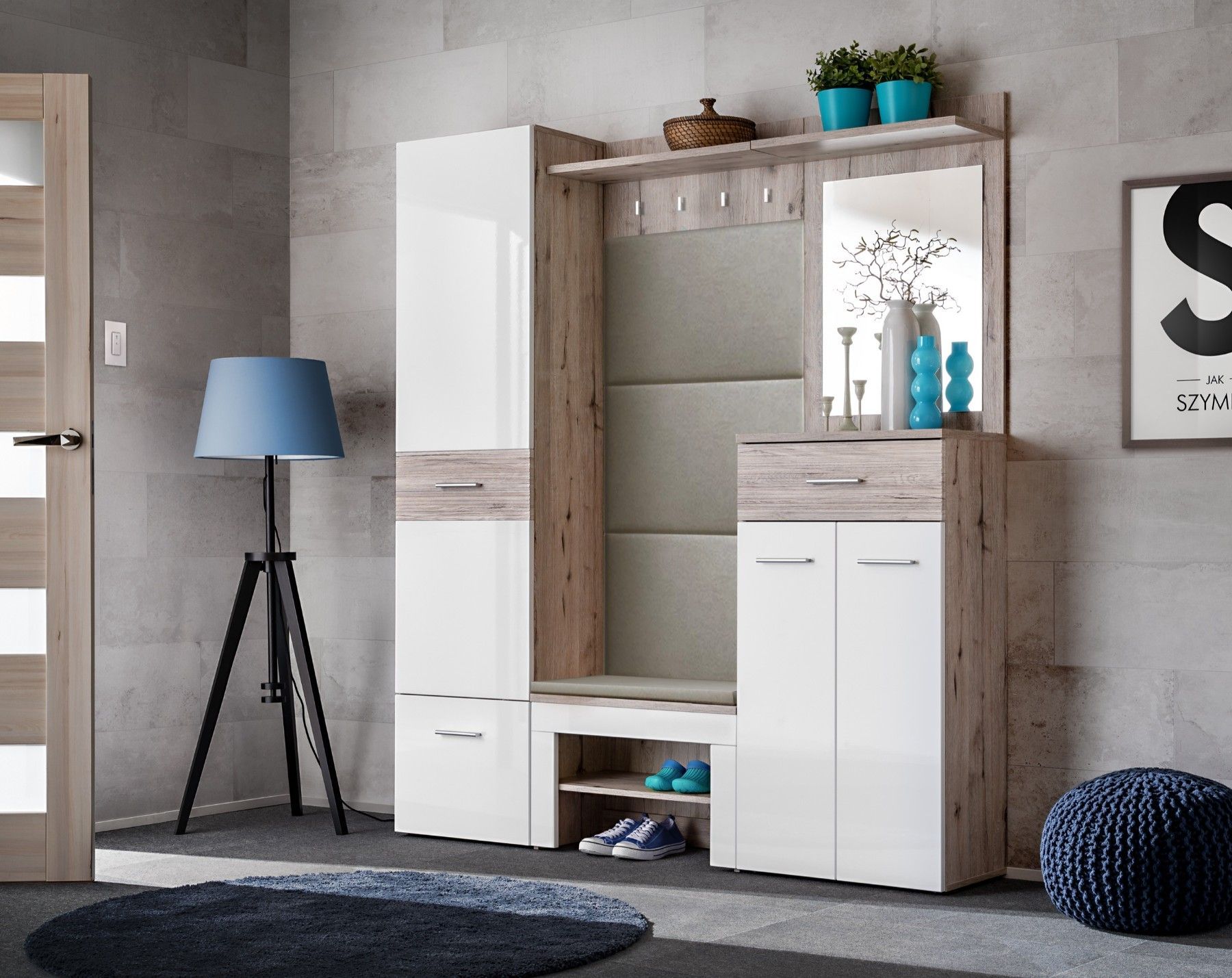 Flur Garderobe Gustavo VIII Hochglanzfronten + Spiegel Beschreibung Schrank: rechts befindet sich ein Schrank mit zwei Hochglanztüren, innen zwei normale Ablagen, oben eine Schublade, darüber ein Wandpaneel mit einer normalen Ablage und Spiegel. In der Mitte befindet sich eine Sitzbank mit Kissen un