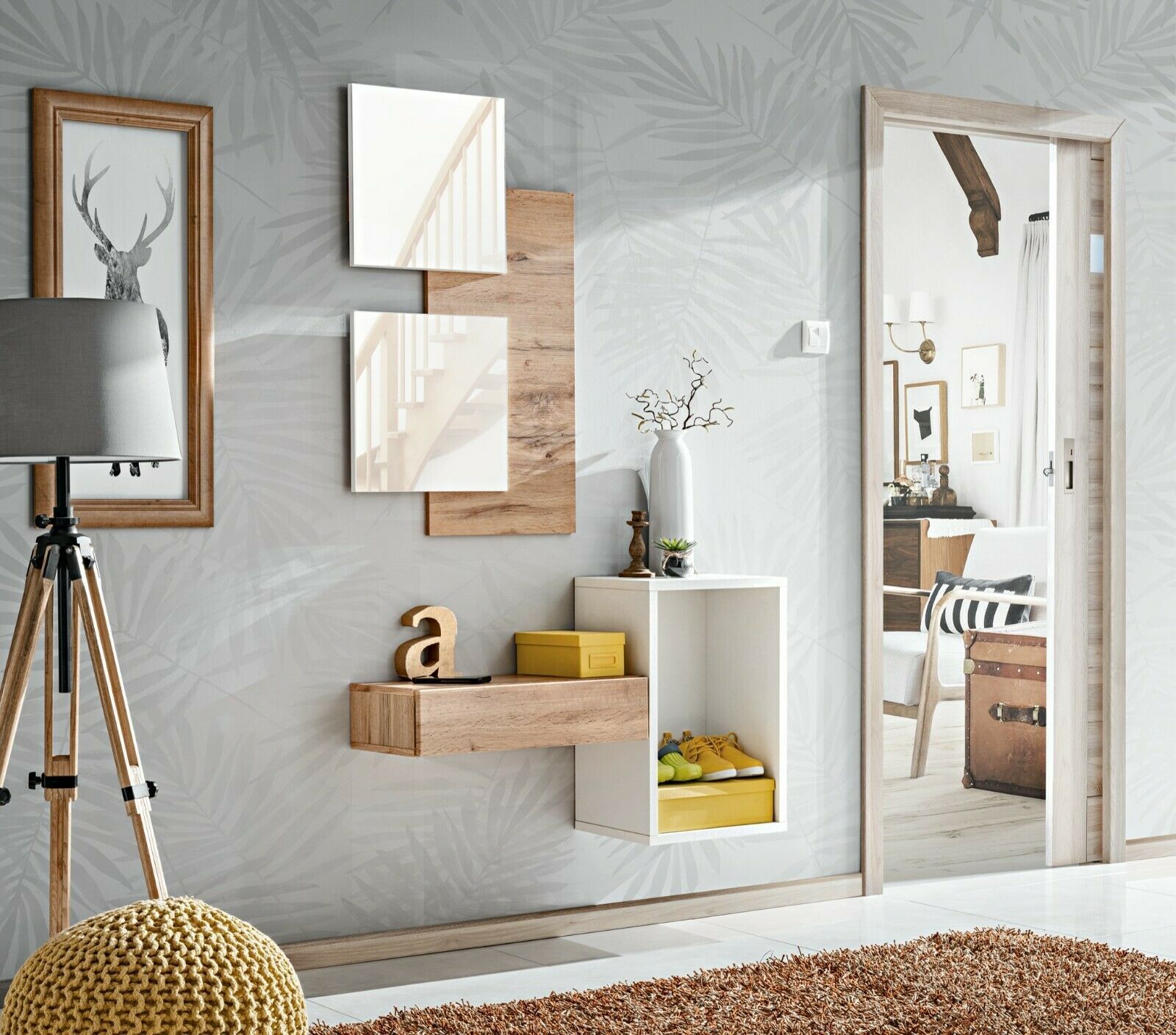 Flur Garderobe Easy I PVC Front + Spiegel Beschreibung Garderobe: im Set sind ein Paneel mit zwei Spiegel, ein Schrankregal und eine Schublade mit einer PVC Front. Inkl. Spiegel. Inkl. Push - Click. Inkl. PVC Front. Schranz zur Selbstmontage. Sehr einfache Montage. Bauanleitung enthalten. Dimensione