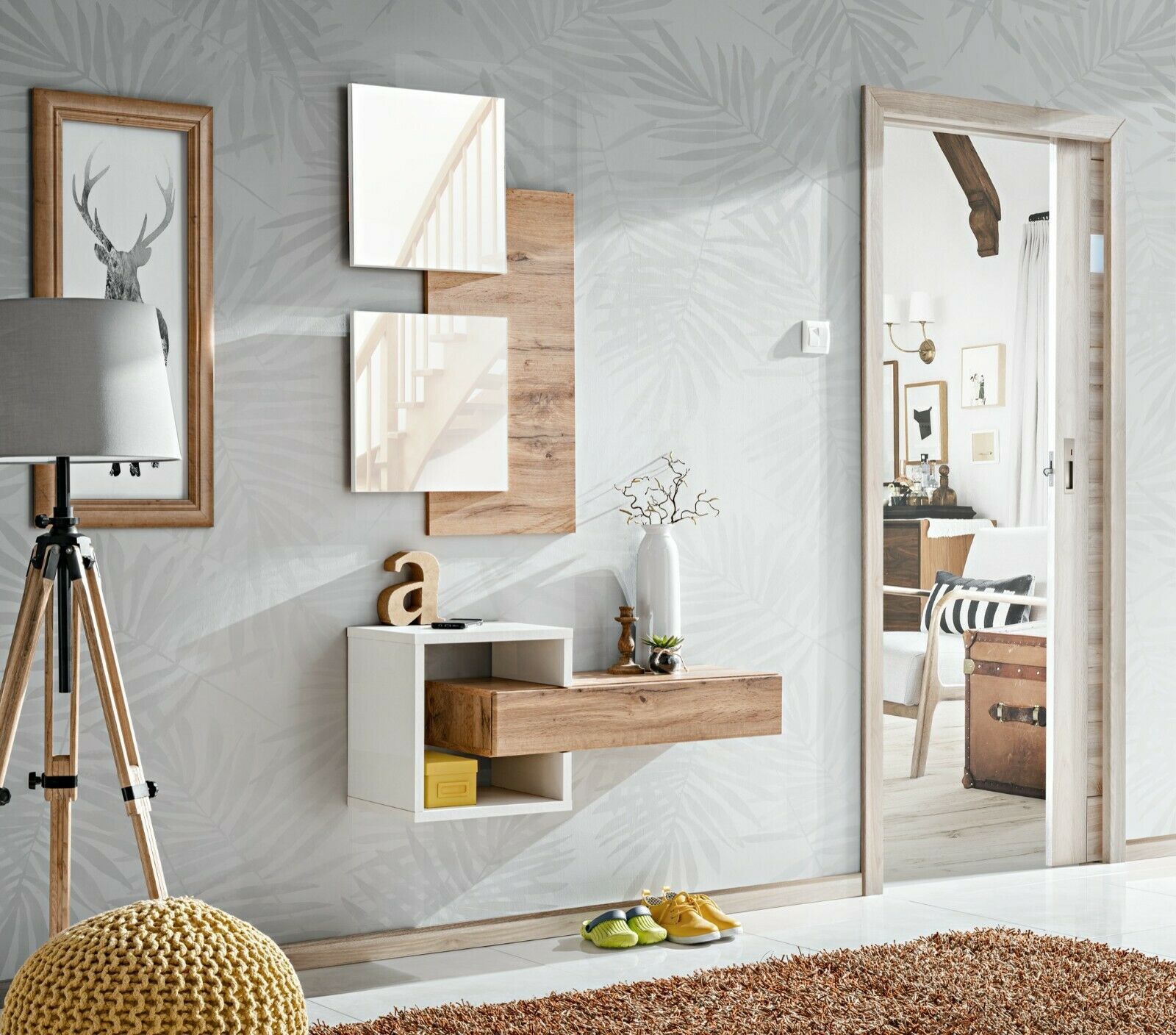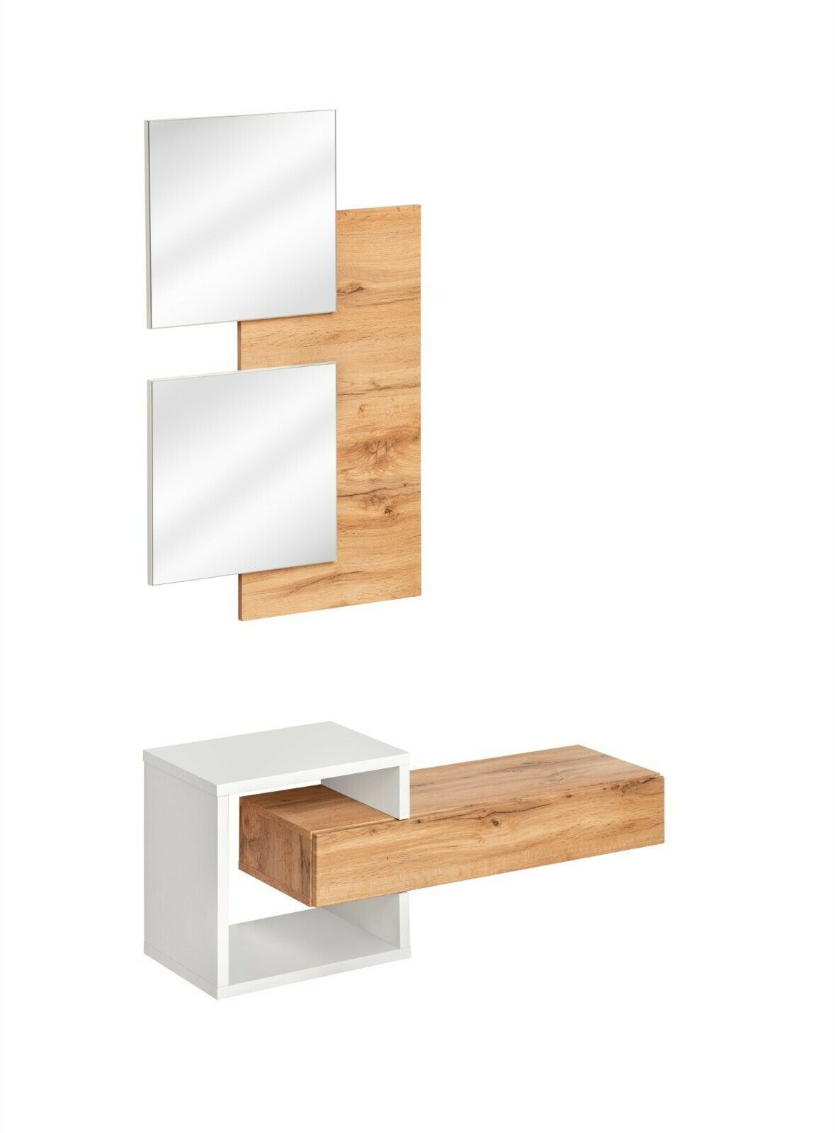 Flur Garderobe Easy II PVC Front + Spiegel Beschreibung Garderobe: im Set sind ein Paneel mit zwei Spiegel, ein Schrankregal und eine Schublade mit einer PVC Front. Inkl. Spiegel. Inkl. Push - Click. Inkl. PVC Front. Schranz zur Selbstmontage. Sehr einfache Montage. Bauanleitung enthalten. Dimension