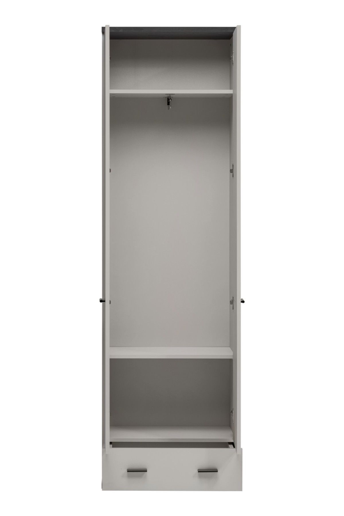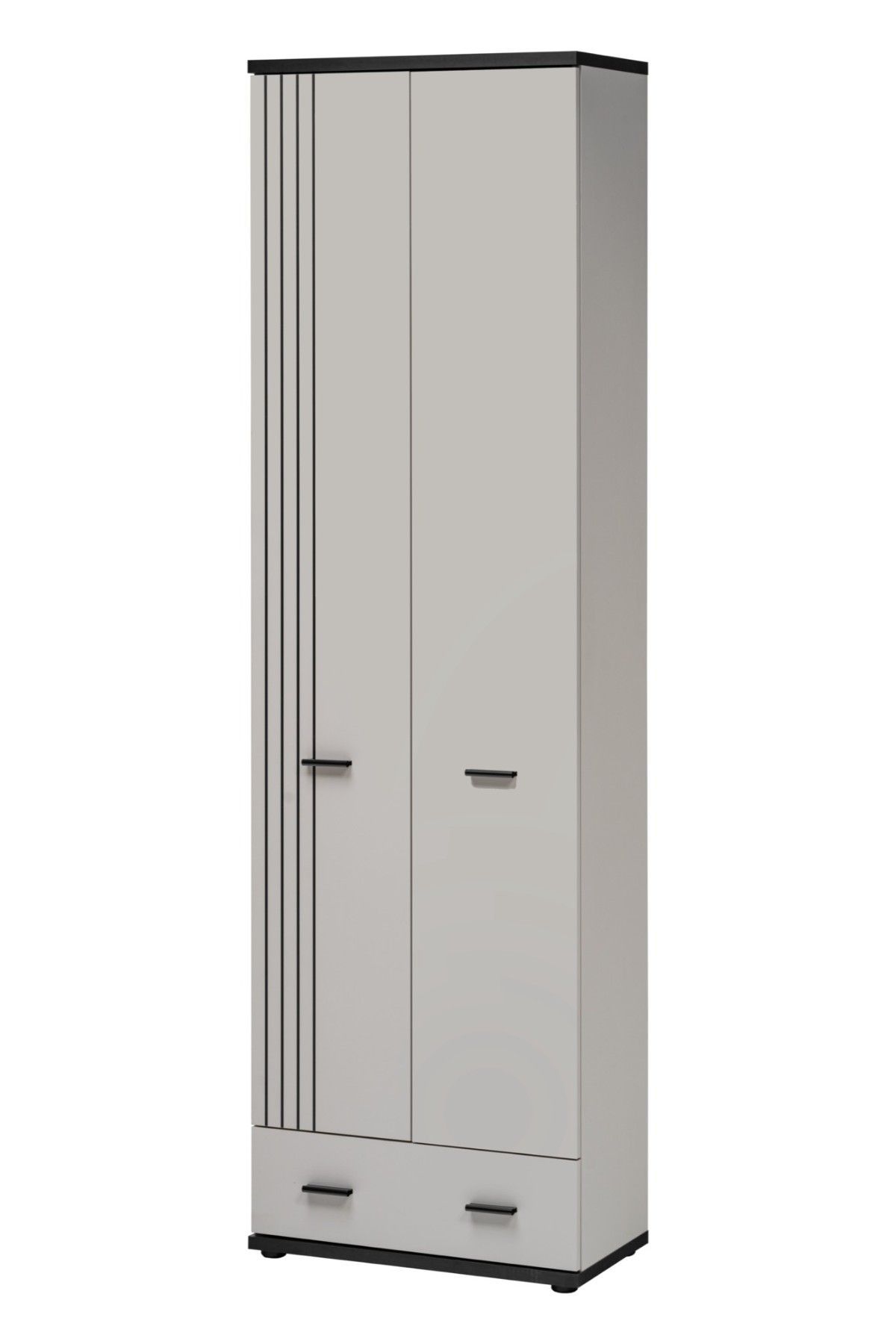 Flurgarderobe Hugo III Streifen und Sitzbank, Spiegel Beschreibung Schrank: rechts befindet sich ein Schrank mit zwei Streifen lackierten Türen, innen zwei normale Ablagen, oben eine Schublade, darüber ein Wandpaneel mit einer normalen Ablage und Spiegel. In der Mitte befindet sich eine Sitzbank mit