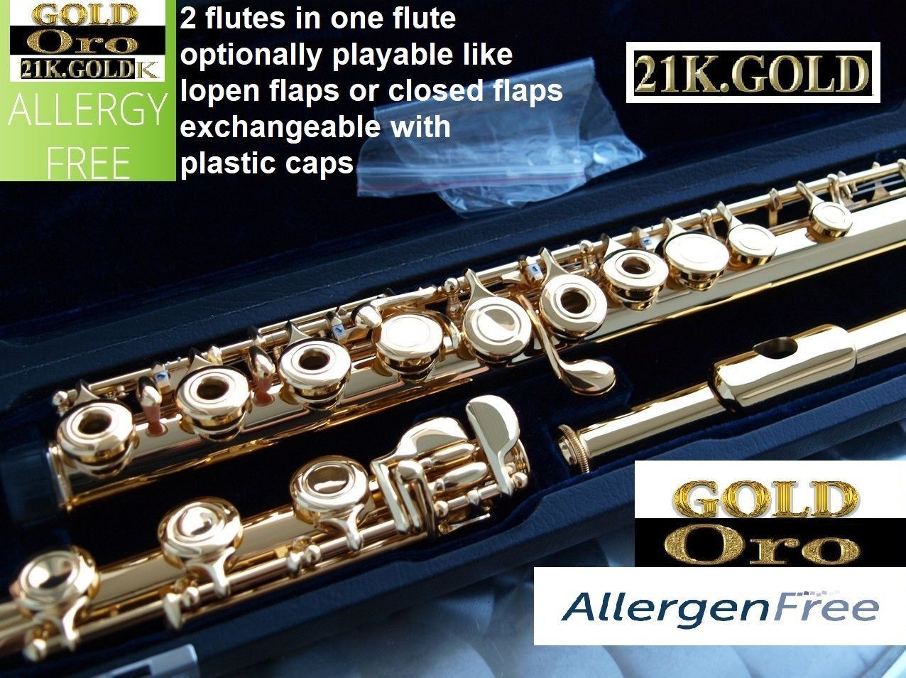 * * * * * * * * * * GOLDFLÖTE Gold 21 Karat vergoldet Querflöte aus deutscher Produktionsprüfung Allen Modellen ist die große Klangbrillianz zu Eigen.Dies umfasst die 5 K, 14 K, 18 K, und sogar die unglaubliche 21 K Goldflöte (siehe Tabelle). 17 Karat entspricht 750 Gold,22 Karat 916 gold .21 karäti