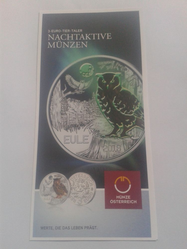 Folder 3 euro 2018 Österreich Eule Serie Tiertaler Münze leuchtet im Dunkeln