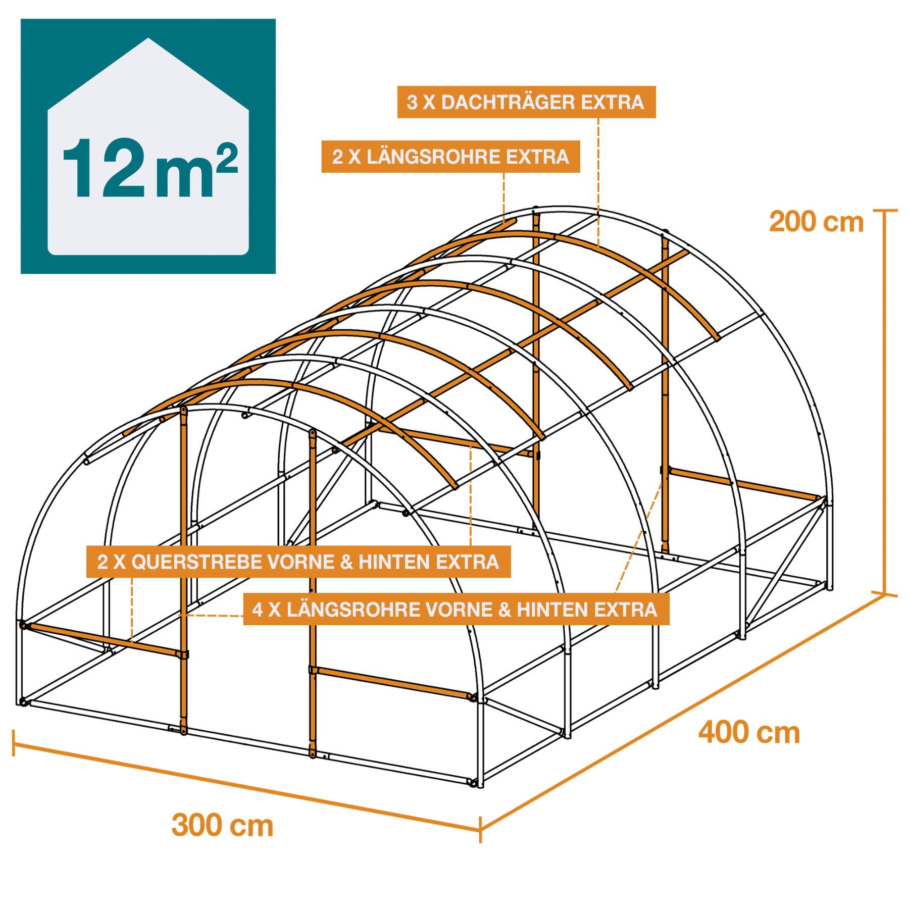 GH-1200 - TOM Gewächshäuser » 12 m²« Die hochwertigen und extra stabilen TOM Foliengewächshäuser sind in drei Größen erhältlich: 6 qm, 12 qm und 18 qm. Diese Gewächshäuser bieten den perfekten Platz für die An- und Aufzucht von Gemüse, Obst und Pflanzen. Varianten und Maße XL - 12 m² - 300 x 200 x 4
