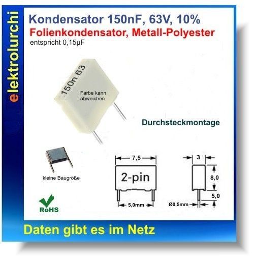 Sie bieten hier auf folgenden Artikel 10 Stück Folienkondensator Metall-Polyester 150nF 63Volt, 10%, RM5mm Typ: Folienkondensator Kapazität Nennspannung: 150nF, 63Volt Abmessungen: b=7,5mm x h=8mm x 3mm Rastermaß: 5mm Drahtlänge: 5mm Temperatur: -40 bis 85°C Toleranz: 10% Anschluß: Durchsteckmontage