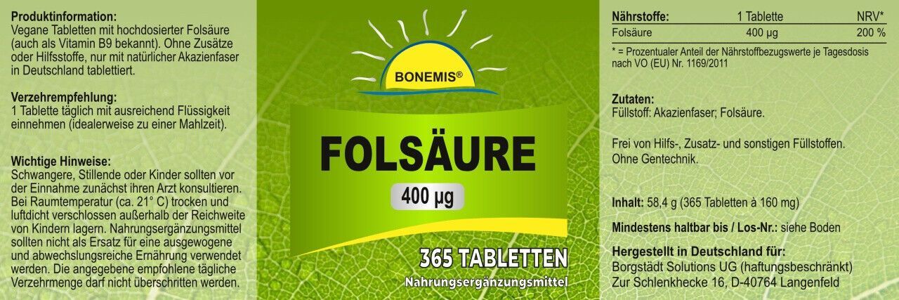 Folsäure (Vitamin B9, hochdosiert, ohne Zusätze), 365 Tabletten, Bonemis®