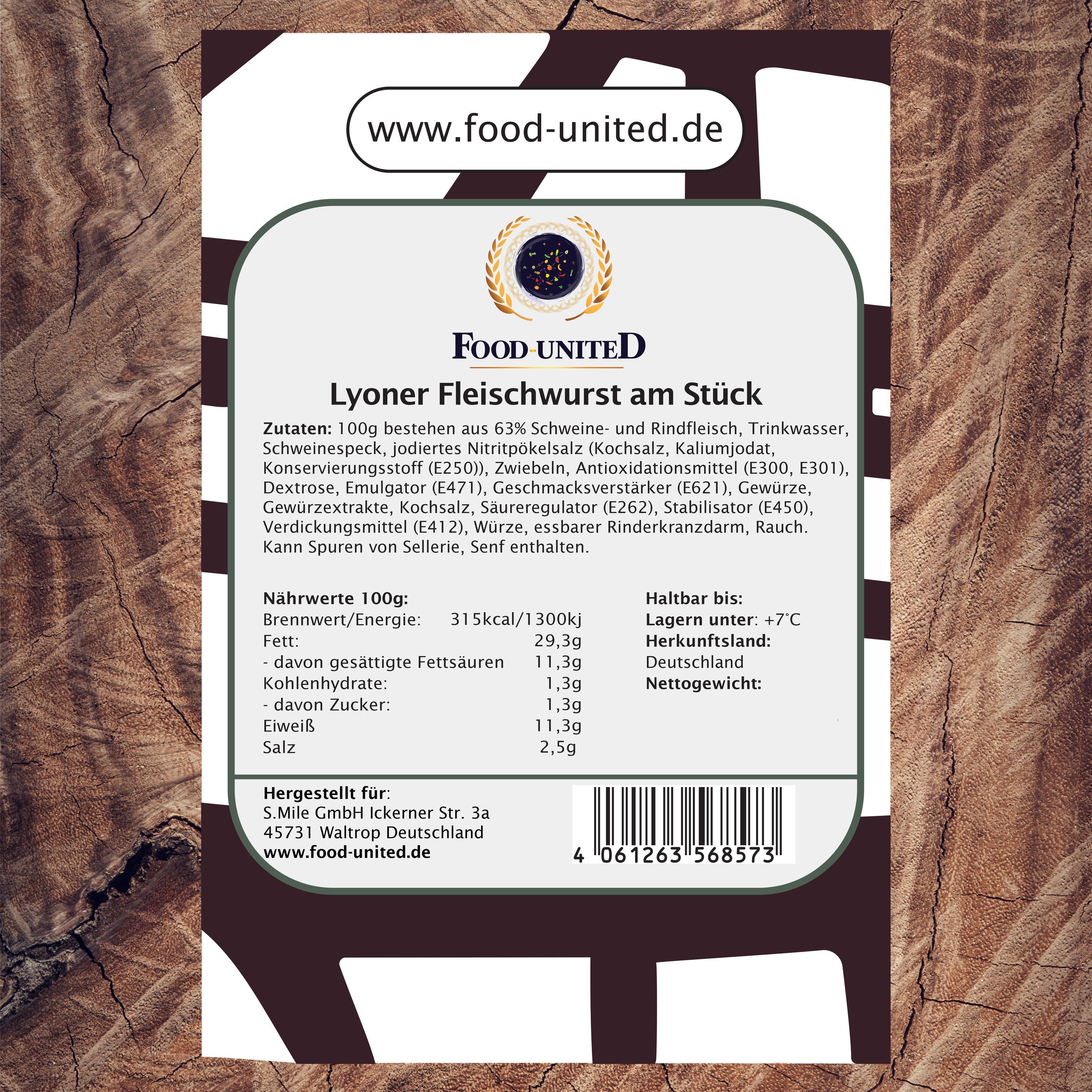 Food-United Lyoner Fleischwurst am Stück 1000g 2 Stück im Ring geräuchert