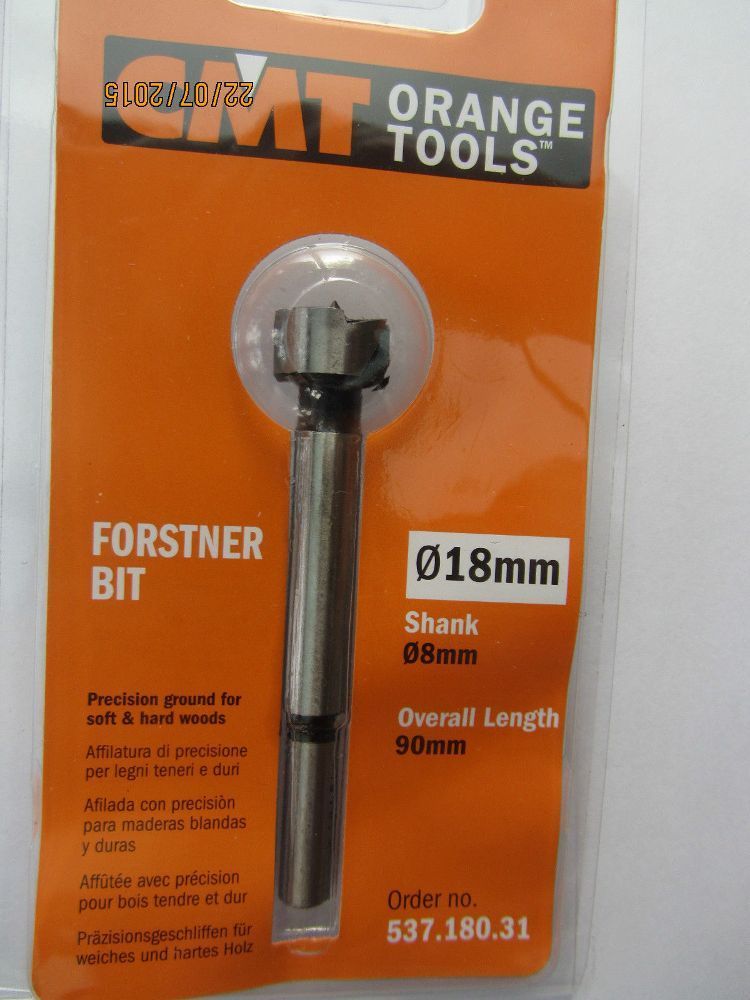 Forstnerbohrer SP-Stahl Hersteller: CMT ORANGE TOOLS Maße: Durchmesser 18 mm Schaft 8 mm Durchmesser 30 mm lang Gesamtlänge 90 mm neu und original verpackt zum Bohrern von Sacklöchern ohne Ausrisse in Weichholz präzisionsgeschliffene Zentrierspitze 2 präzisionsgeschliffene Hauptschneiden (Z2) 2 präz
