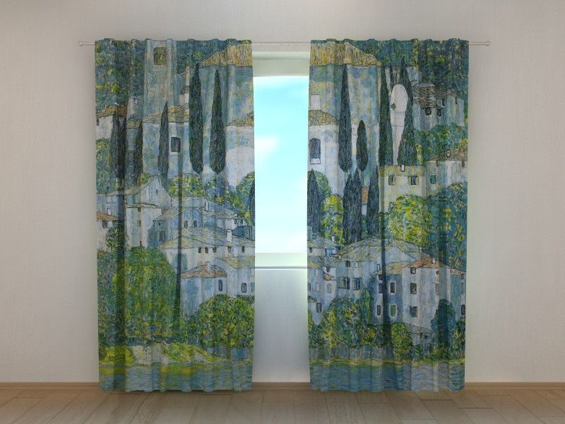 Fotogardine Dorf gemalt, Fotovorhang mit Motiv, Digitaldruck, Gardine auf Maß