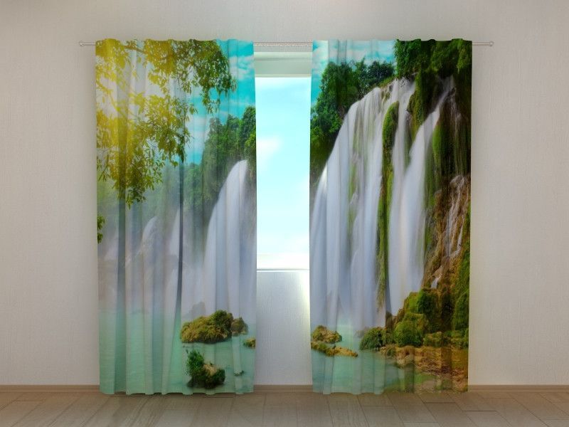 Fotogardine Wasserfall im Sommer, Fotovorhang mit Motiv, Digitaldruck, auf Maß