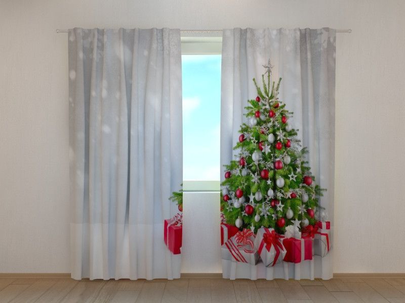 Fotogardine Weihnachtsbaum in Silber und Rot, Vorhang mit Motiv, Fotodruck, auf Maß