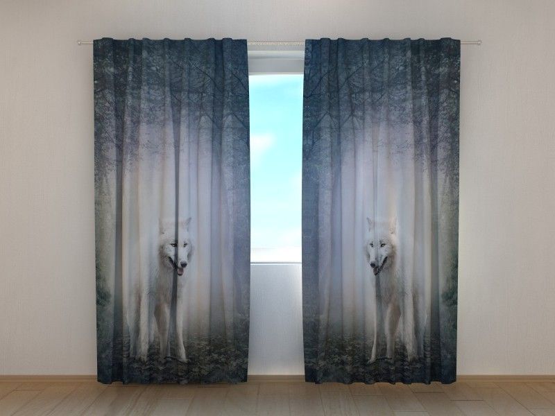 Fotogardine weißer Wolf im Wald, Vorhang mit Motiv, Digitaldruck, Gardine auf Maß