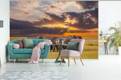 • Fototapete - 330x220 cm - Elefantenherde bei Sonnenuntergang (Gr. 330x220 cm)