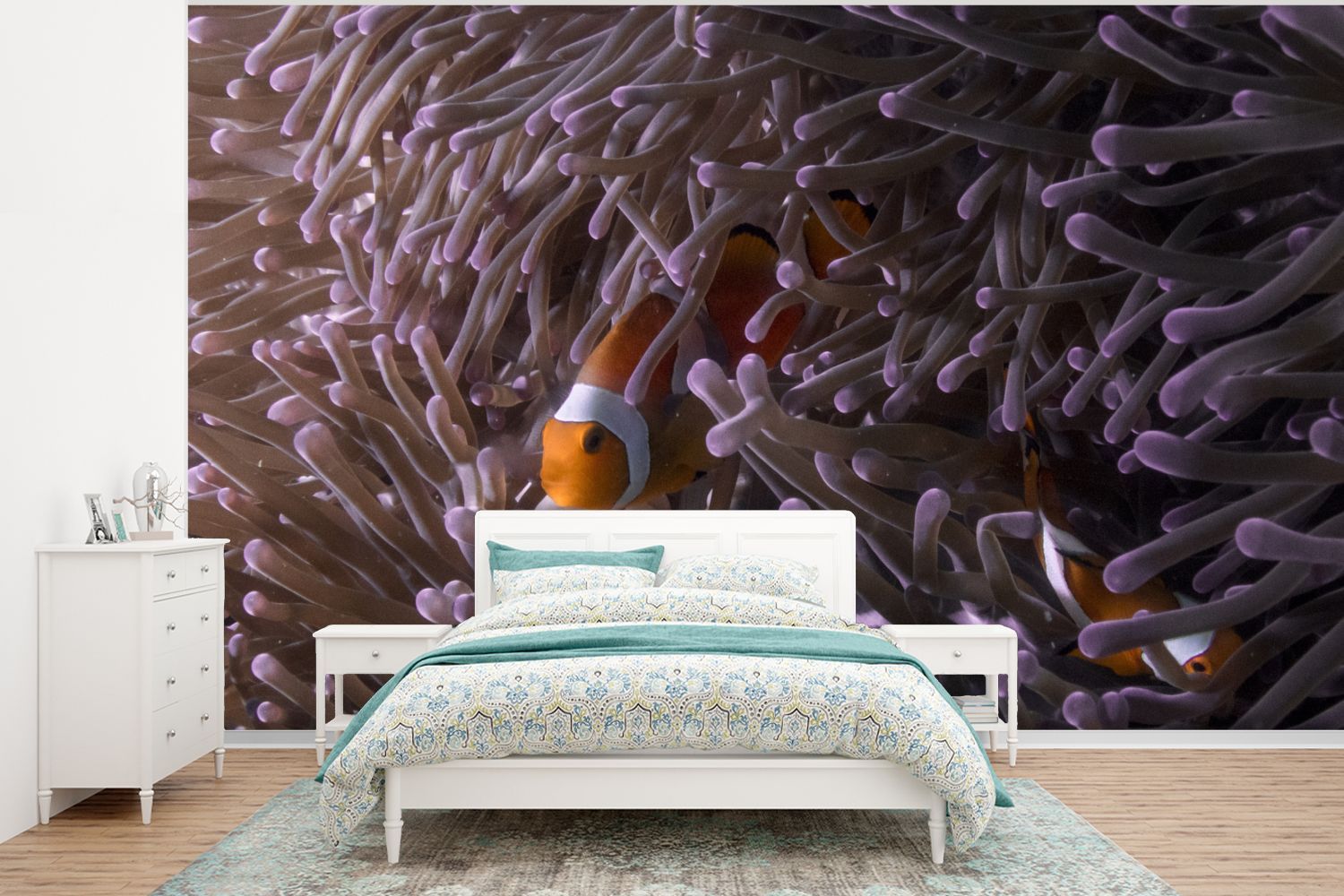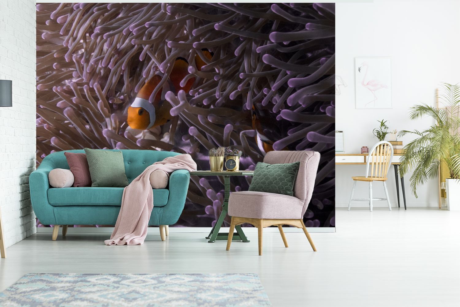 Fototapete - 350x260 cm - Clownfisch versteckt zwischen den Seeanemonen