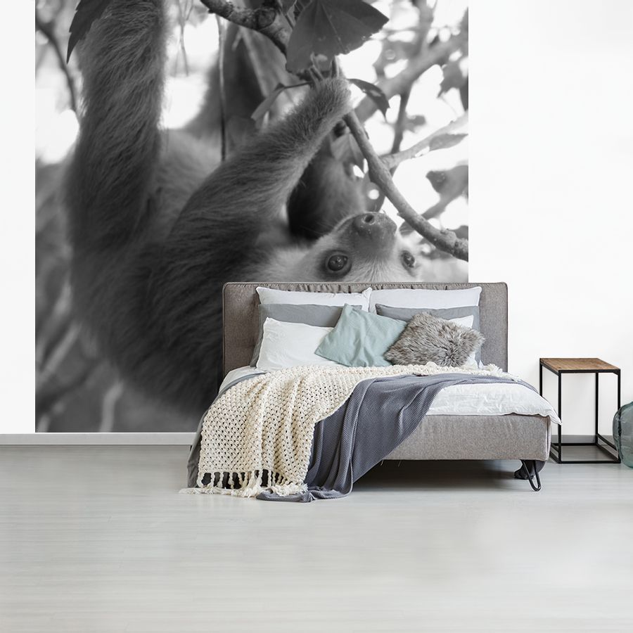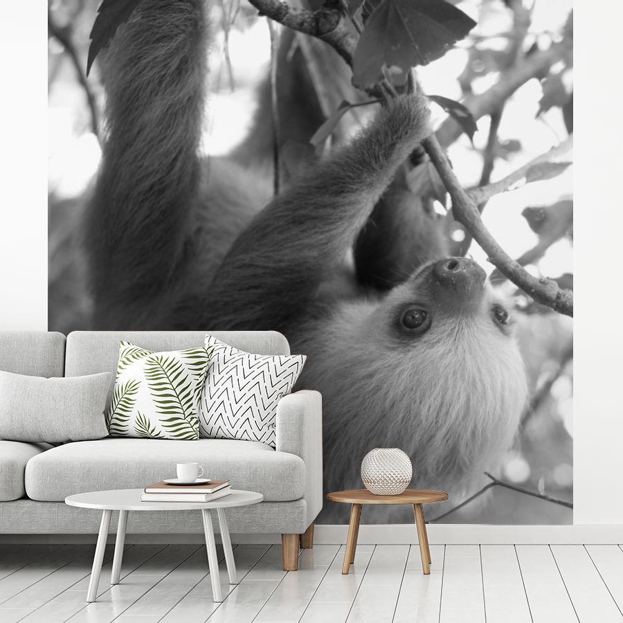 Fototapete - 350x350 cm - Baby-Faultier im Regenwald von Costa Rica in schwarz und we