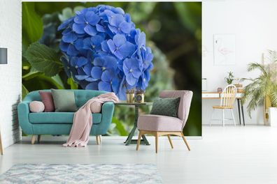 • Fototapete - 375x280 cm - Blaue Hortensienblüte in einem Garten (Gr. 375x280 cm)
