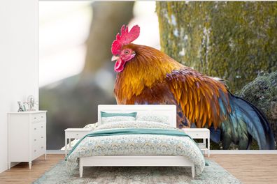 • Fototapete - 375x280 cm - Ein Hahn sitzt auf einem Ast eines Baumes (Gr. 375x280 cm)