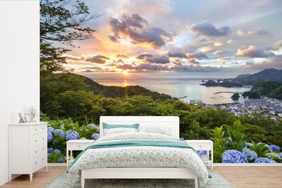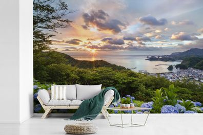 • Fototapete - 390x260 cm - Sonnenuntergang über Hortensienblüten (Gr. 390x260 cm)