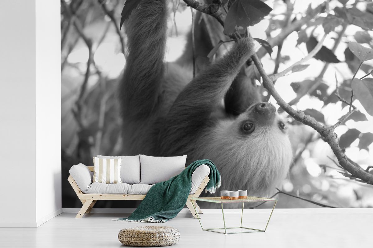 Fototapete - 600x400 cm - Baby-Faultier im Regenwald von Costa Rica in schwarz und we